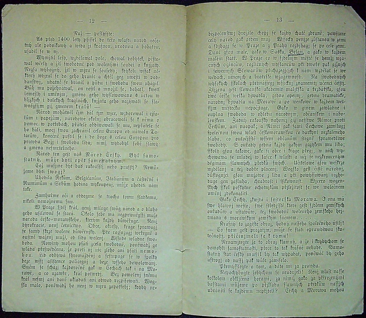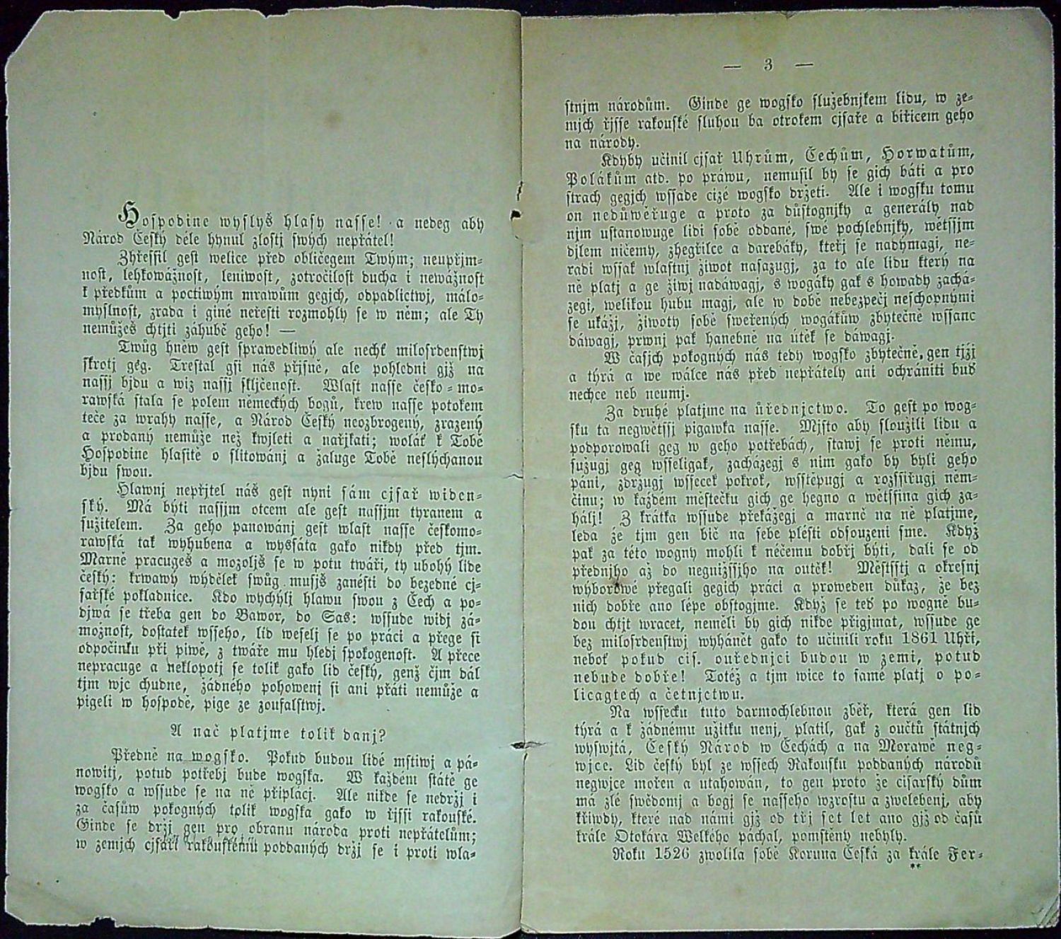 Tištěno švabachem. Na přední straně obálky v prolamovaném oválu zakomponovaném do rostlinného ornamentu antikvou tištěná výzva "SEBERME SE!", koncová tiskařská ozdůbka. Na konci tištěná datace "Pod Blaníkem, koncem Čerwence Léta Páně 1866". - Původní brožurka přes hřbet přelepená šedou pap. páskou, na přední straně obálky při vnitřním horním okraji utržený kousek papíru(cca 1 x 0,8 cm), poslední list při vnějším okraji v délce cca 4 cm podlepený průsvitnou páskou a vedle pásky lehce natržený.<br>Kritické úvahy anonymního autora a rakouské politice a společnosti vnímané z českého historicky podmíněného pohledu.