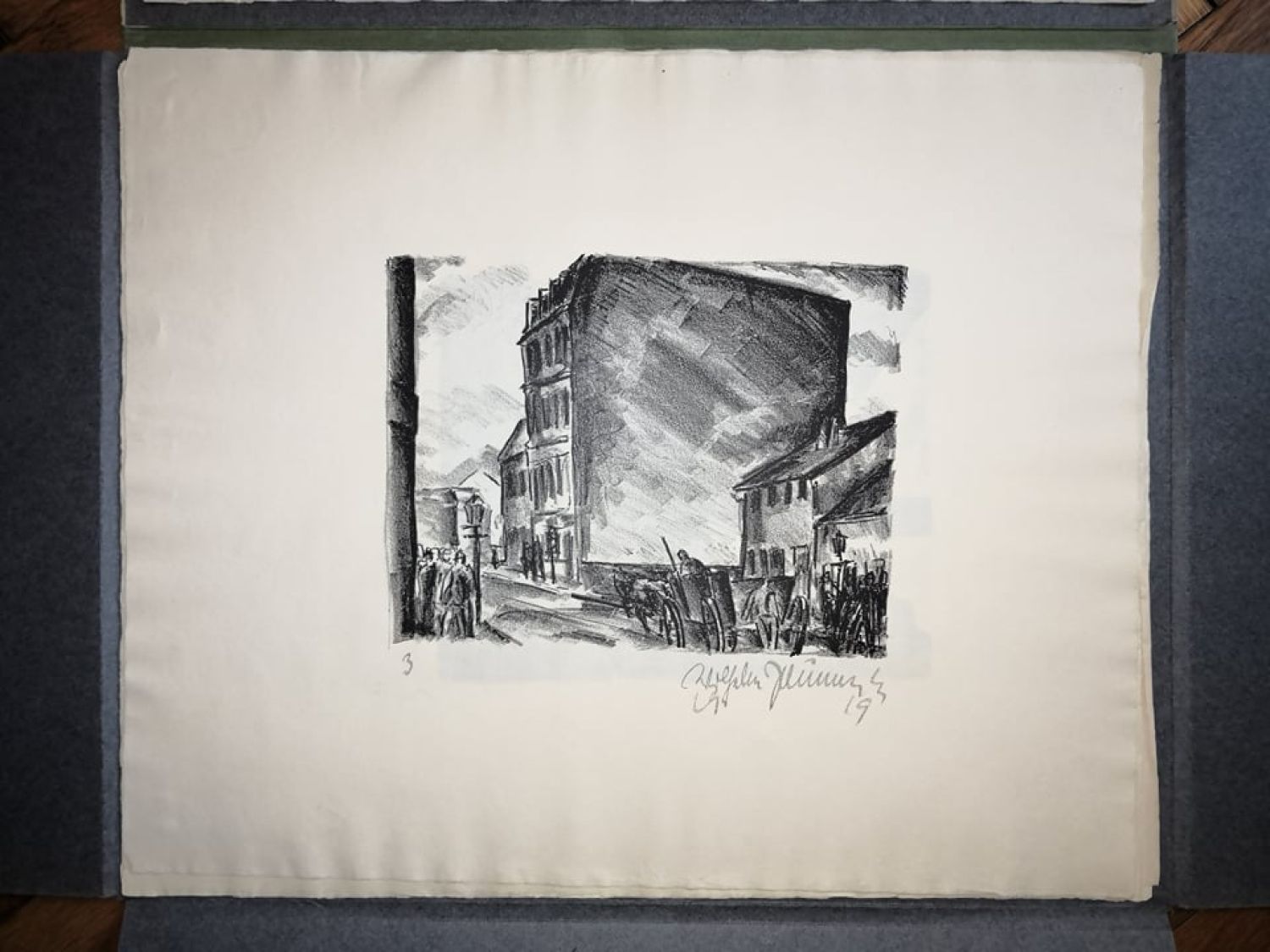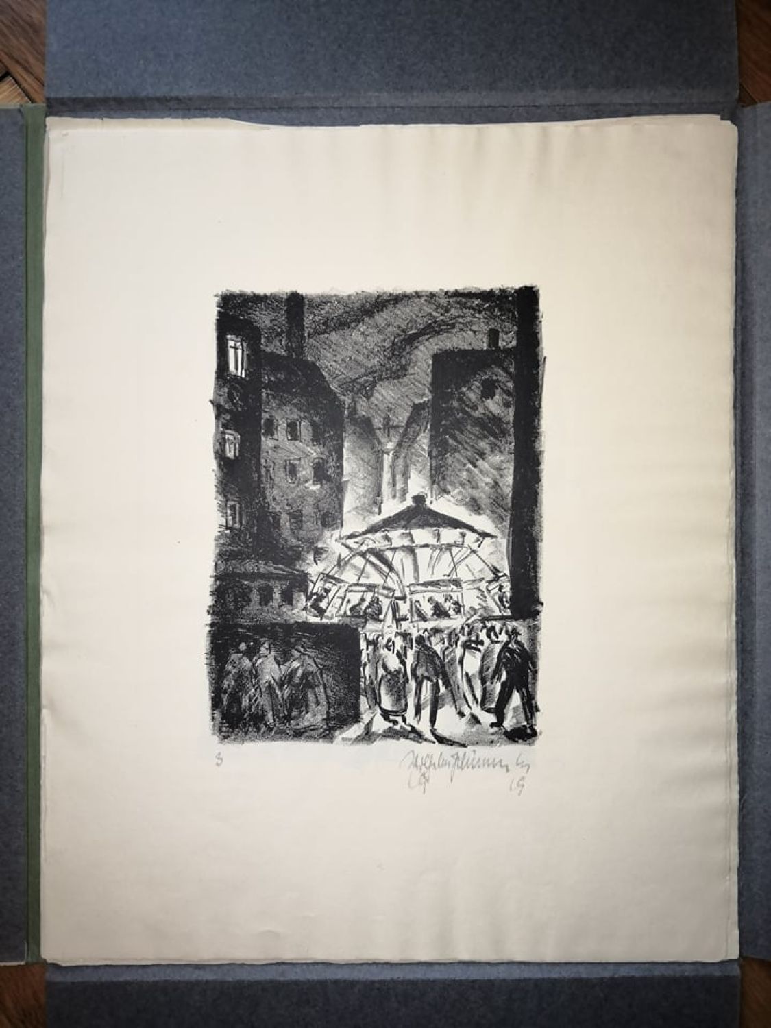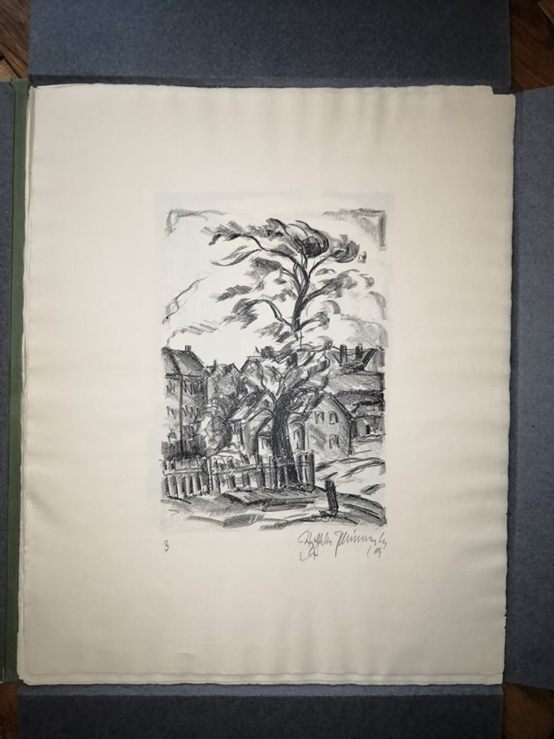 Exemplář číslo 3 z 20 výtisků na pravém Zandersu (exempl. č. 21-100 byly tištěny na mědirytinovém papíru). Každý list je autorem vpravo dole tužkou podepsán a datován, vlevo dole tužkou číslo tisku. Deset listů o celkovém rozměru papíru 62 x 51 cm. Původní kartonová vazba s plátěným hřbetem, na přední desce původní litografie. Přední deska mírně zašpiněná, spodní okraj hřbetu lehce natržený, grafické listy ve stavu velmi dobrém. Na rubu přední desky nalepen původní štítek s tiráží. Na zadní straně vazby chlopně ve kterých jsou volně vloženy grafické listy.<br>Wilhelm Plünnecke (1894 Hannover - 1954 Stuttgart), německý malíř, grafik a ilustrátor. Studoval u Emila Orlika v Berlíně a později na akademii v Lipsku. Byl členem "Hannover Sezession".