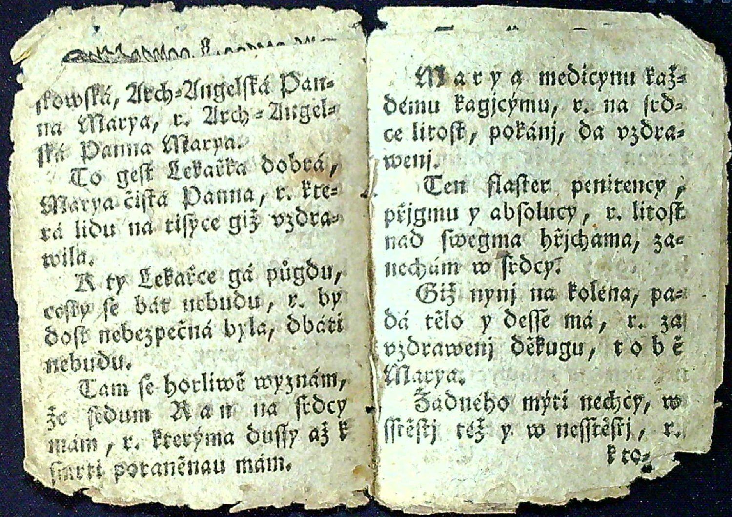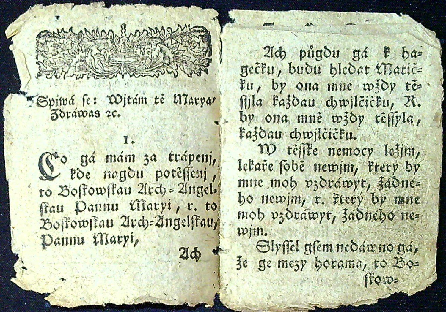 Knihopis 10507 (eviduje 3 ex.)<br>Tištěno švabachem, stránkové kustody, na tit. listu v prolamovaném rámečku dřevoryt Panny Marie Boskovské (45 x 40 mm), v záhlaví první strany textu dřevořezový vlys, vstupní iniciála zalomená do výše 2 řádků. - Papír zahnědlý a při okrajích potrhaný. Zakoupeno ze sbírky významného sběratele Rudolfa Hlavy ze Semil.