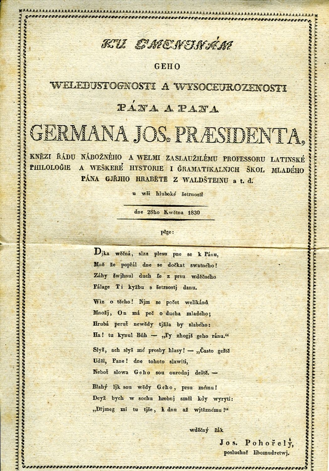 KU GMENJNÁM GEHO WELEDUSTOGNOSTI A WYSOCEUROZENOSTI PÁNA A PANA GERMANA JOS. PRAESIDENTA, KNĚZI ŘÁDU NÁBOŽNÉHO A WELMI ZASLAUŽILÉMU PROFESSORU LATINSKÉ PHILOLOGIE A WEŠKERÉ HYSTORIE I GRAMATIKALNJCCH ŠKOL MLADÉHO PÁNA GJŘJHO HRABĚTE Z WALDŠTEINU a t. d. u wši hluboké šetrnosti dne 28ho Kwětna 1830 pěge: ... wděčný žák ... posluchač libomudrctwj.