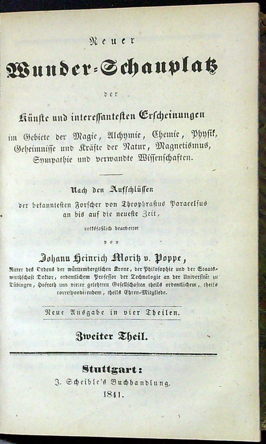 Neuer Wunder=Schauplatz der Künste und interessanten Erscheinungen im Gebiete der Magie, Alchymie, Chemie, Physik, Geheimnisse und Kräfte der Natur, Magnetismus, Sympathie und verwandte Wissenschften. Nach den Aufchlëssen der bekanntesten Forscher von Theophrastus Paracelcus an bis auf die neueste Zeit. Erster + Zweiter Theil (von 4).