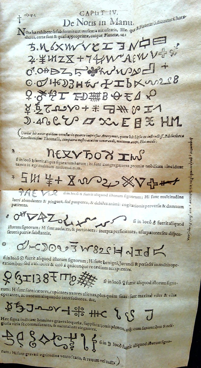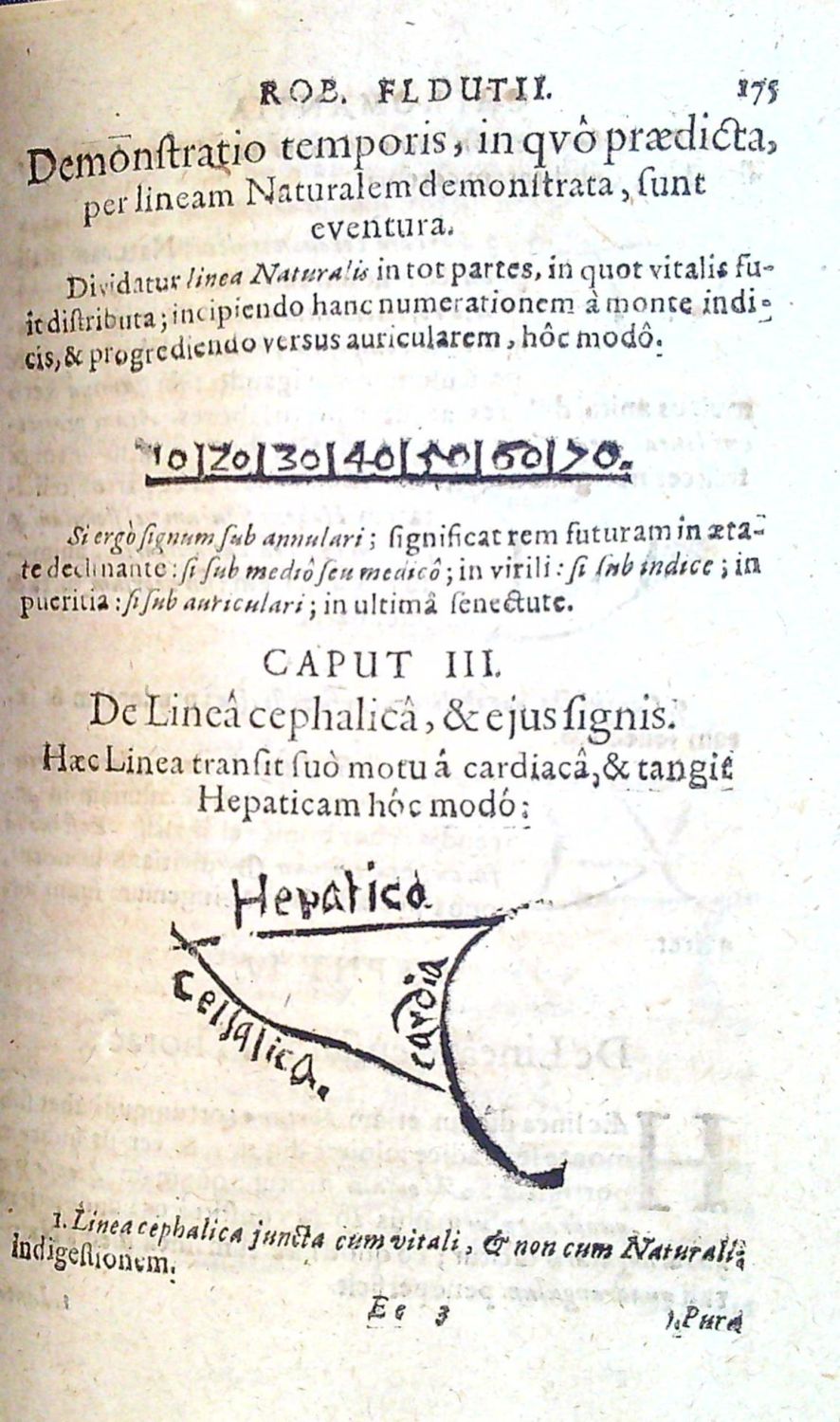 Caillet 8950; Dorbon A,3772.<br>Měděrytinový předtitul sign. J. B. Paravitinus s ukázkami různých dlaní a zobrazující situace čtení z ruky a proložený citacemi z Bible a antických autorů, mírně oříznutý, v textu řada drobných a několik celostr. dřevořezů dlaní, lidských tváří...., jedna rozkládací dřevořezová příloha, plné i ozdobné iniciály, lišty a dřevořezové viněty, špatná paginace. Na straně 157 - 190 pojednání o chiromantii od významného anglického filosofa, mystika a alchymisty Roberta Fludda. Dobová kožená vazba se čtyřmi vazy ve hřbetu, ve druhém poli dobový kožený štítek s tlačeným a zlaceným věcným a jmenným názvem, vazba mírně odřená, jinak ve stavu velmi dobrém.