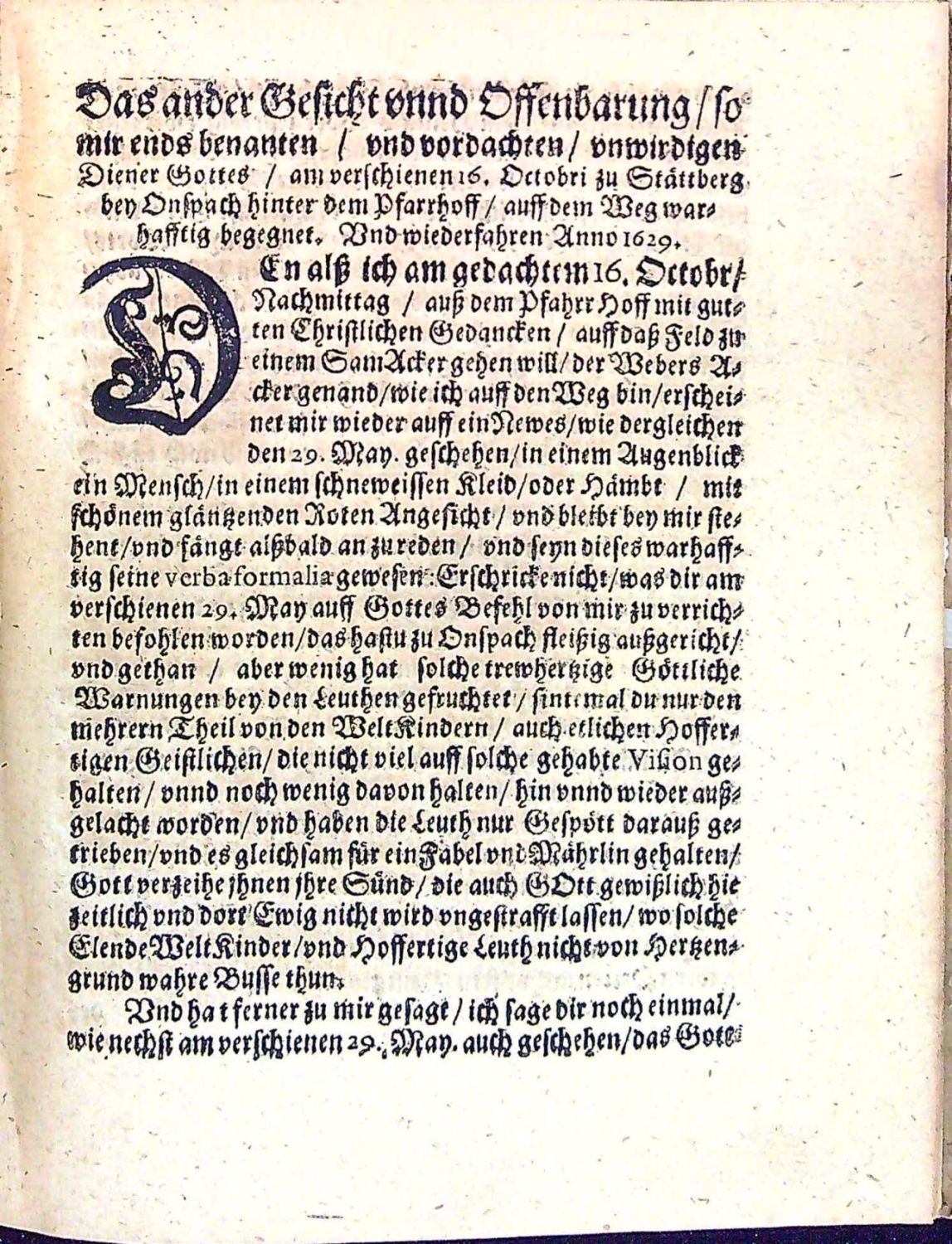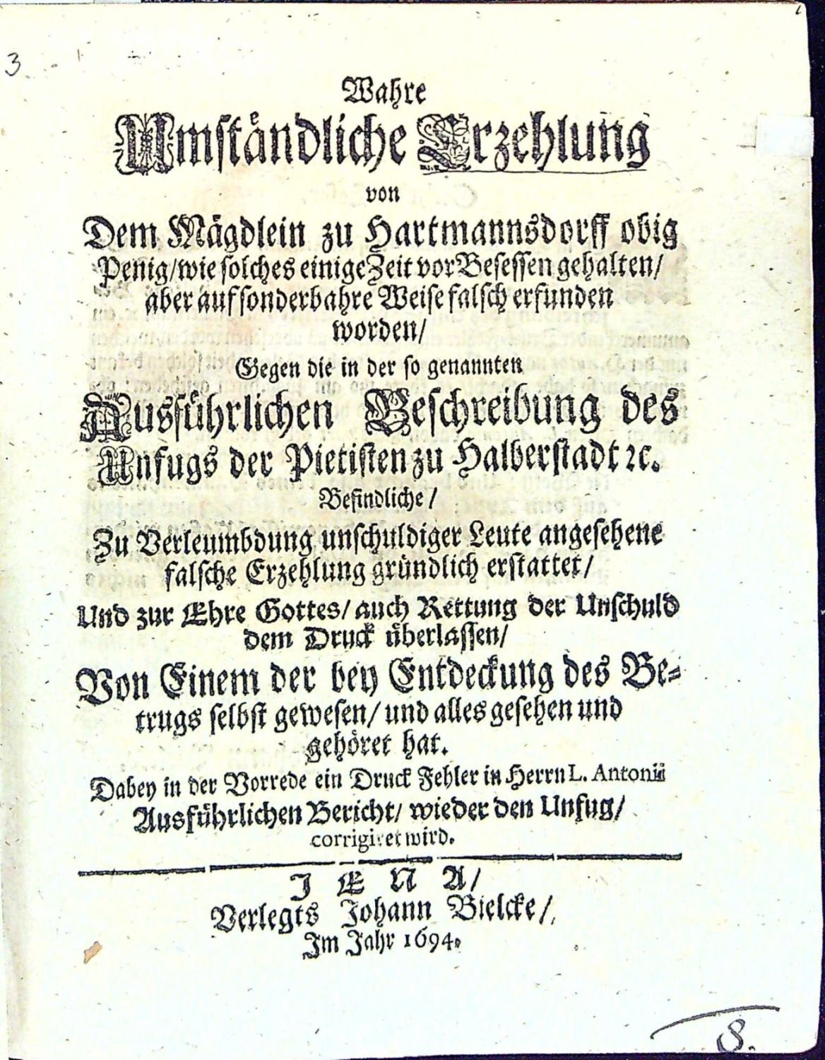 Dünnhaupt 3183,61.<br>Tištěno švabachem, latinský text antikvou, hebrejský hebrejsky, koncová viněta ze sluníček, na tit. listu ozdobná lišta z ornamentů.<br>+ 1. přívazek: Geier, Johann Christoph "I. N. I. Schrifftmässige Engels=Probe Das ist: Unterschiedener vornehmer/ Hochgelahrter reiner Lutherischer Theologen geistreiche und in Gottes Wort gegründete Judicia und Bedencken Was heutiges Tages von Englischen Gesichten und Erscheinungen zu halten? Ob ihnen zu trauen? solche zu begehren/ und zu hören? Bey Gelengenheit des Von Weynachten biss aufs Johannis=Fest In einer Tauben=Gestalt erschienenen Geistes oder vermeynten Engels zu Ober=Grossen im Uhlstädischen Kirch=Spiel Wegen entstandener Irr=und Verwirrung vieler Oerter zu eines iedweden Nachricht gezeiget von ..." Jena, Johann Meyer, 1695. 38 stran, tištěno švabachem, latinský text antikvou, arabská paginace stran uprostřed horního okraje v kulatých závorkách mezi drobnými lístky, vstupní pásový vlys s ilustrací, iniciály propletené úponky zalomené do výše 2-3 řádků, tučně tištěná plná iniciála ve výši 2 řádků zasazená do ilustrace zalomené do výše 6 řádků (KVK eviduje pouze 1 ex. v Universitní a zemské knihovně v Halle).<br>+ 2. přívazek: "Wahre Umständliche Erzehlung von Dem Mägdlein zu Hartmannsdorff obig Penig/ wie solches einige Zeit vor Besessen gehalten/ aber auf sonderbahre Weise falsche erfunden worden/ Gegen die in der so genannten Ausführlichen Beschreibung des Unfugs der Pietisten zu Halberstadt etc. Besindliche/ ....". Jena, Johann Bielcke, 1694. 8 nepagin. listů, tištěno švabachem, latinský text antikvou. Vstupní plná iniciála na ornamentálním pozadí zalomená do výše 5 řádků, v úvodu slovo ke čtenáři od nakladatele J. Bielcka.<br>+ 3. přívazek: "Engelische Erscheinungen/ Öffenbahrungen und Gesichte/ so dreyen Christlichen Personen/ einem Schulmeister in der Pfaltz/ einem Pfarherren im Marggraffthumb Anspach/ und einer Jungfrawen zu Gresslas in Böhmen/ zu unterschiedlichen Zeiten wiederfahren/ vom Zustande dess Römischen Reichs/ .....". Bez místa tisku, nakladatele, 1630. 28 nepagin. listů (poslední čistý). Tištěno švabachem, latinské nadpisy a slova antikvou, na tit. listu lišta z ornamentů, pásové vlysy a lišty z ornamentů, plné iniciály propletené úponky zalomené do výše 2-6 řádků, dvě plné iniciály na pozadí z rostlinného ornamentu zalomené do výše 5-7 řádků. Od folia F-III až do konce popsáno vidění mladé ženy z horského městečka "Gresslas" (Kraslice ?) u Chebu.<br>+ 4. přívazek: "Göttliches Wunder=Buch/ Darinnen auffgezeichnet vnd geschriebewn stehen/ I. Himlische Offenbarungen vnd Gesichte/ einer gottfürchtigen Jungfrawen auss Böhmen/ vom Zustand der Christlichen Kirchen/ derer Erlösung vnd schrecklichen Untergang ihrer Feinde. II. Propheceyungen/ Klagreden/ vnd ernstliche Bussvermahnungen/ eines frommen Christlichen Mägdleins zu Cottbus in NiederLausitz. III. Christliche Sprüche/ vnd schrifftmässige/ geistreiche Reden/ einer gottsehligen Jungfrawen/ im Fürstlichen Frawenzimmer zu Stettin in Pommern. Erstlich eintzelen aussgangen/ an jetzo aber zusammen getragen/ den Abtrünnigen Unbussfertigen zu einer trewen Vermahnung/ zur wahren Busse vnd Widerkehrung/ .... Bez místa tisku, vydavatele, 1630. 92 nepaginovaných listů. Tištěno švabachem, názvy měsíců antikvou. Titulní list v dvojitém rámečku zdobeným ornamentem, ozdobné lišty a tyče z ornamentů, plné iniciály propletené úponky zalomené do výše 3-5 řádků, vstupní vlys z ornamentů, viněty. - V prvním oddílu zaznamenané vidění Kristiny Poniatowské (1610 - 6.12. 1644 Lešno) - dcera polského šlechtice, bratrského duchovního Juliana Poniatowského, který byl také knihovníkem Karla staršího z Žerotína. Po smrti matky žila u baronky Zárubové z Hustiřan na zámku v Horní Branné v Podkrkonoší, kde Komenský připravoval odchod bratří do exilu. V listopadu a prosinci prodělala Kristína několik záchvatů se zrakovými a sluchovými halucinacemi, přivolaný Komenský uvěřil v pravdivost jejích tvrzení. Po příchodu do Lešna ubytoval Komenský Kristinu ve svém domě a písemně zaznamenal 82 jejích vidění, které pak zveřejnil v překladech a několika vydáních. Roku 1632 se Kristina provdala za člena Jednoty bratrské a správce lešenské tiskárny Daniela Strejce a záchvaty a vidění se již neopakovaly. <br>+ 5. přívazek: [Petersen, Johann Wilhelm] "Send=Schreiben An einige Theologos und GOttes=Gelehrte/ Betreffend die FRAGE Ob GOtt nach der Auffahrt Christi nicht mehr heutiges Tages durch göttliche Erscheinung den Menschenkindern sich offenbahren wolle und dessen gantz begeben habe. Sampt einer erzehlten SPECIE FACTI Von einem Adelichen Fräulein/ was ihr vom siebenden Jahr ihres Alters biss hieher von GOTT gegeben ist". Bez místa tisku a vydavatele, 1691. 26 nepaginovaných listů, německý text švabachem, latinská slova antikvou, na tit. listu viněta a slovo Frage v názvu tištěno versálkami na pozadí z ornamentů, vstupní plná iniciála na ornamentálním pozadí zalomená do výše 5 řádků, spisek obsahuje celkem 42 arabsky paginovaných tezí, na posledním listu tiskové opravy. (Exemplář se liší vinětou na tit. listu a typologicky od digitalizovaných exemplářů v KVK).<br> + 6. přívazek: Spenner, Philipp Jacob "Theologisches Bedencken über einige Puncten/ Nahmentlich: 1. Die gerühmte Offenbahrungen eines Adelichen Fräulein. 2. Den D. Petersen Superint. zu Lüneburg/ und das von Ihm behauptete tausend Jährige Reich Christi und 3. Die so genannten Pietischen angehende. Von einem Liebhaber der Wahrheit zum Druck besordet". Bez místa tisku a vydavatele, 1692. Tištěno švabachem, latinská slova antikvou, 8 nepaginovaných listů, vstupní pásový vlys z ornamentů.<br> + 7. přívazek: Winckler, Johann "Sch
