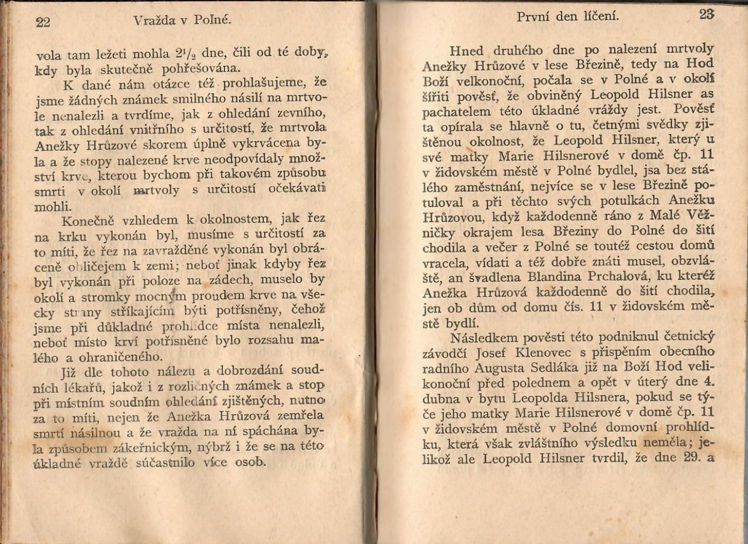 Přelíčení s Hilsnerem před porotou v Kutné Hoře pro vraždu v Polné. Doslovný otisk stenografických protokolů. 1. den přelíčení. (Pouze 1. a 2. den přelíčení z 5)