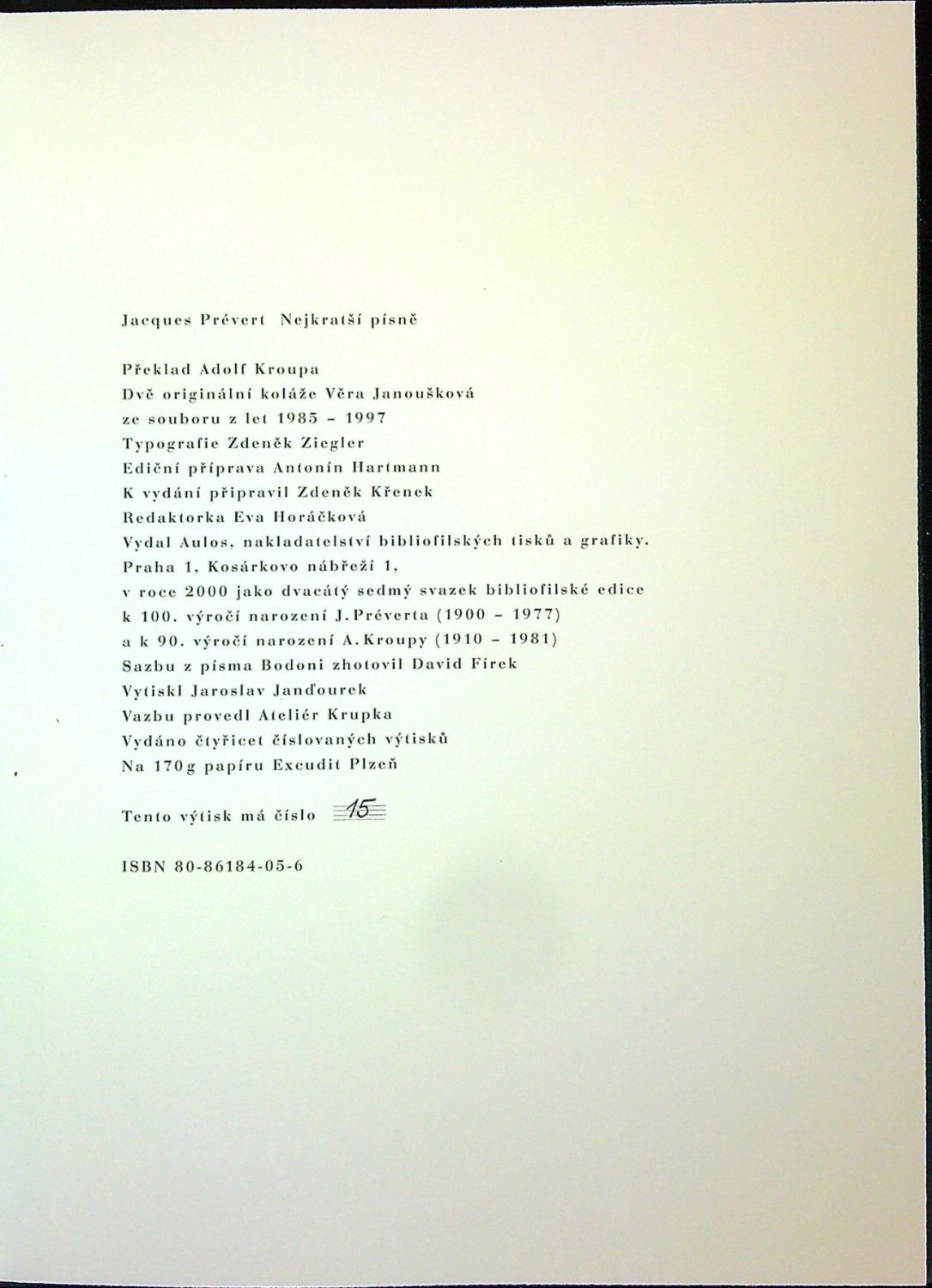 | Nakladatel / tiskar: | Aulos, Zdeněk Křenek jako 27. svazek bibliofilské edice |