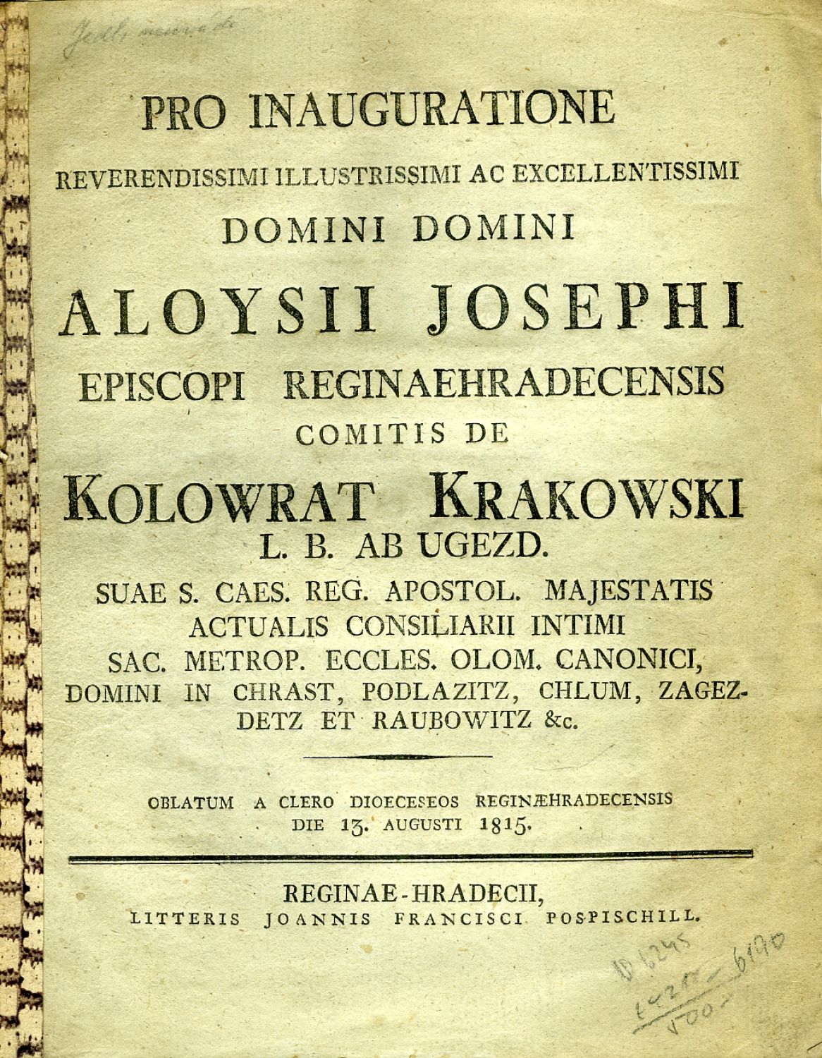 Pro Inauguratione Reverendissimi Illustrissimi ac Exellentissimi Domini Domini Aloysii Josephi Episcopi Reginaehradecensis Comitis de Kolowrat Krakowski L. B. ab Ugezd. … Oblatum a clero dioeceseos Reginaehradecensis die 13. augusti 1815.