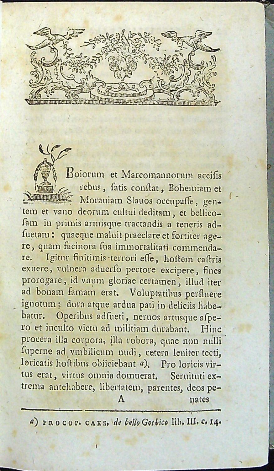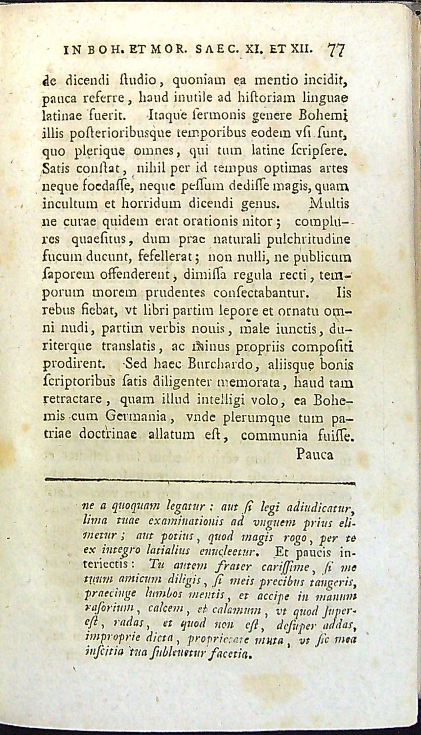 Knihopis 14386; Voit 724<br>Latinský text a česká slova antikvou, řecká alfabetou, signatury, stránkové kustody, arabské číslování stran při horním vnějším okraji, živá záhlaví, poznámky pod čarou, vstupní viněta s pohledem na opevněné město olemovaná barokní kartuší, za předmluvou další dvě viněty, koncová viněta.<br>Dobová kartonová vazba. V textu tu a tam drobné světle hnědé mapky způsobené kyselostí papíru.<br>František Faustin Procházka (13. 1. 1749 Nová Paka - 2. 12. 1804), kněz, lingvista a historik, společně s Fortunátem Durychem přeložil do českého jazyka znovu bibli. Nabízené dílo je první soustavnou rukovětí k poznání písemnictví latinského a českého, které vzniklo na půdě česko-moravské.