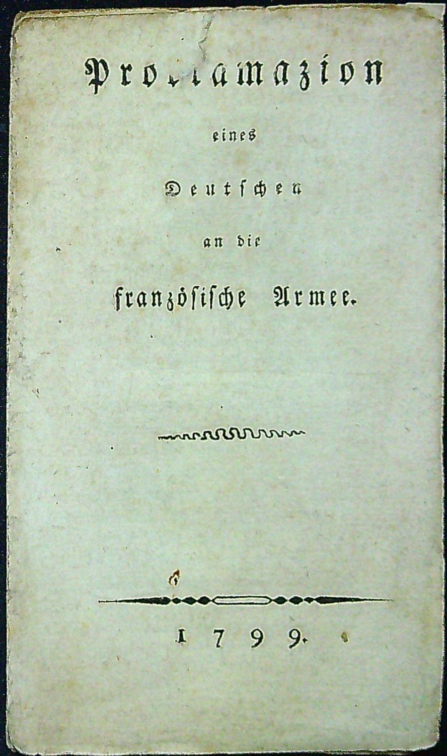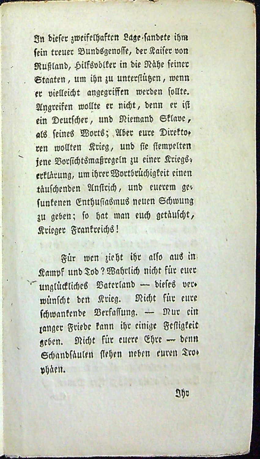 BCBT; SKC; KVK neevidují. <br>Tištěno švabachem, vstupní plná iniciála, prolamovaná ozdobná tyč v záhlaví prvé strany a koncová mizící tyč. - Anonymní apel na francouzské vojáky, aby donutili své vládní despoty k míru a tím zachránili svoji vlast.