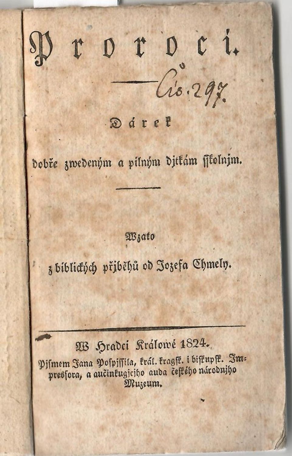 Jungmann VI. 1881 (J. Chmela: Biblické příběhy, Hradec Kr. 1821); Doucha str. 199. - Na tit. l. vepsaná knihovní signatura, listy většinou s hnědými skvrnkami. - Josef Chmela (1793-1847), prof. latinského a řeckého jazyka v Jičíně, později prof. gramatiky na královéhradeckém gymnasiu, naposledy na Starém Městě pražském.