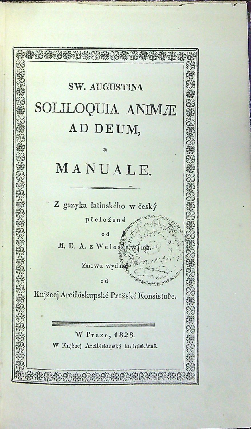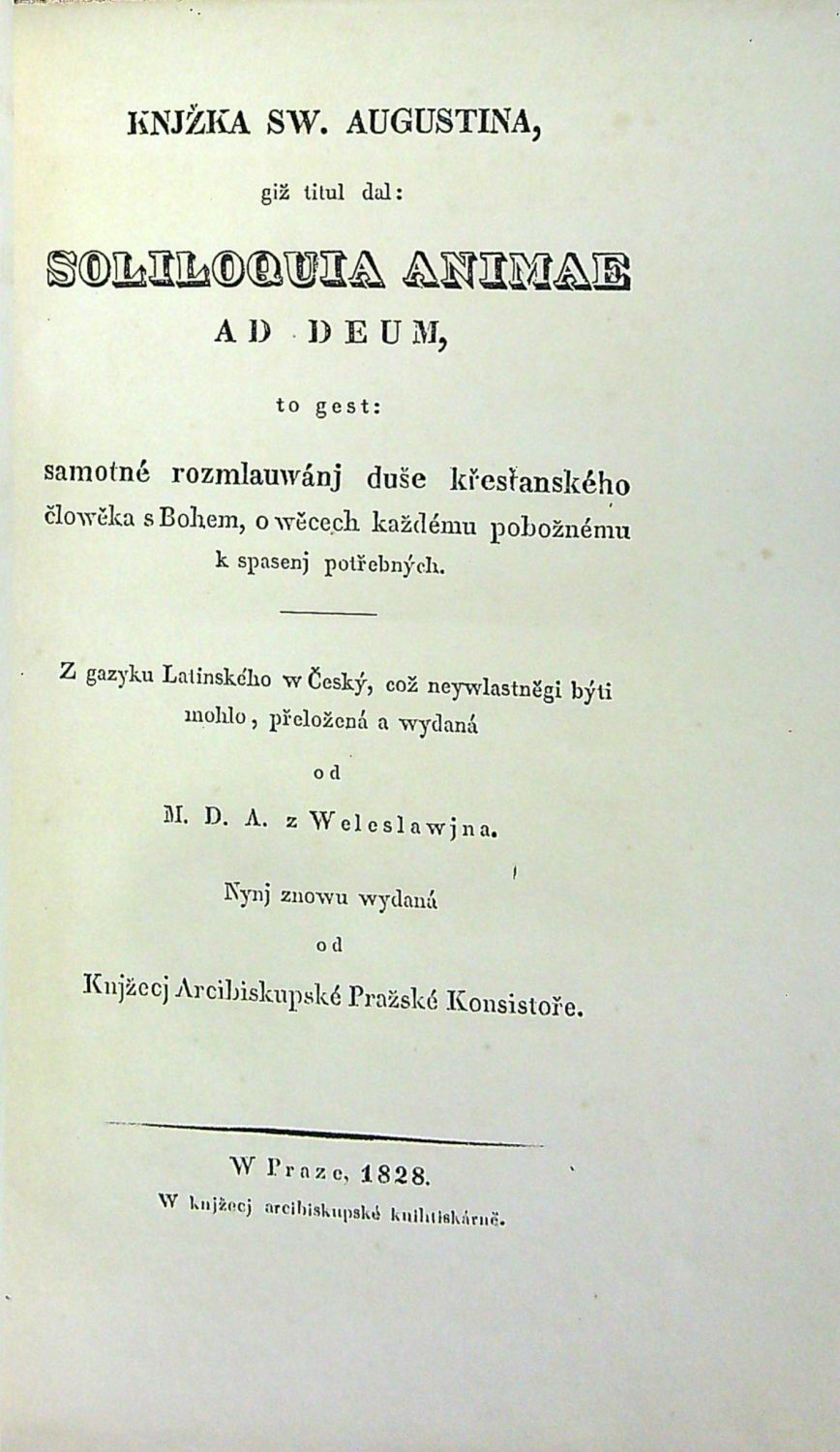SW. AUGUSTINA SOLILOQUIA ANIMAE AD DEUM, a MANUALE. Z gazyka latinského w český přeložené od M. D. A. z Weleslawína. Znowu wydané od Knjžecj Aribiskupské Pražské Konsistoře.