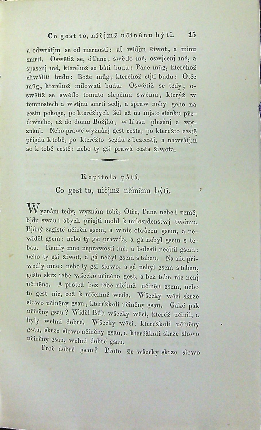 Tištěno antikvou, živá záhlaví, tučně tištěné versálky, mizící linky. Dva titulní list, první s názvem "KNJŹKA SW. AUGUSTINA, giž titul dal: SOLILOQUIA ANIMAE AD DEUM, to gest samotné rozmlauwánj duše křesťanského člowěka s Bohem, o wěcech každému pobožnému k spasenj potřebných". Druhý titulní list (za str. 82) s názvem "KNJŽKA SW. AUGUSTINA, kterauž nazwal: MANUALE, to gest Rukowěť o spatřowánj Pána Krista, aneb o Slowu Božjm, gjmžby se utuchlá paměť žádosti nebeské obnowowala". Průběžná paginace, tištěno na tužším papíře.<br> Dobová kartonová vazba potažená temně fialovým plátnem vytvářejícím moiré efekt. Při horním okraji hřbetu pap. štítek s tištěným názvem, barvená svrchní ořízka, hřbet vybledlý, knižní blok neoříznutý. - Autorem nabízené knihy je neznámý středověký autor vydávající se za sv. Augustina. Knihu přeložil a roku 1583 poprvé vydal Daniel Adam z Veleslavína.
