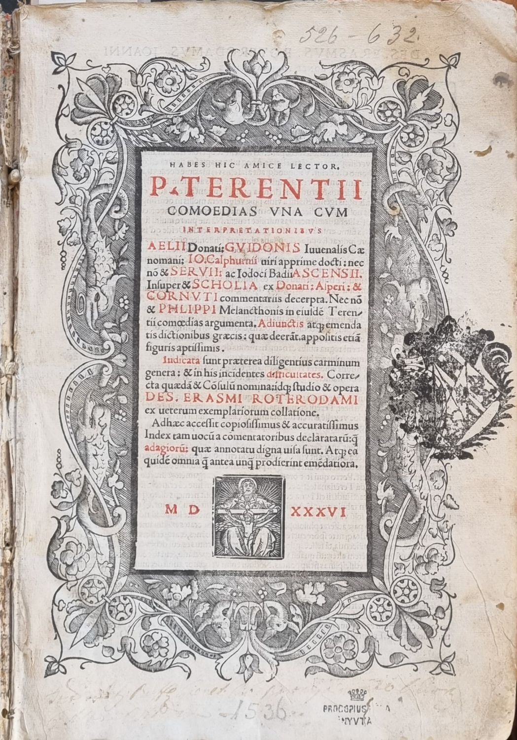 HABES HIC AMICE LECTOR, P. TERENTII COMOEDIAS VNA CVM INTERPRETATIONIBUS AELII Donatii: GVIDONIS Iuuenalis Caenomani; IO. Calphurnii uiri apprime docti: nec no[m] & SERVII: ac Iodoci Badii ASCENSII. Insuper & SCHOLIA ex Donati: Asperi:& CORNVTI commentariis decerpta. Nec no[m] & PHLIPPI Melanc[h]tonis in eiusde Terentii comoedias argumenta. Adiunctis at que emendatis dictionibus graecis: quae deer[m]at, appolisitis etia[m] figuris aptissimis. Indicata sunt praeterea diligentius carminum genera: & in his incidentes difficuitates. Correcta quaeda[m] & Co[n]sulu[m] nomina: id q[ue] studio & opera DES. ERASMI ROTERODAMI ex ueterum exemplatiorum collatione. Ad haec accessit copiosissimus & accuratissimus Index tam uocu[m] a comentatoribus declarataru[m]: q[ue] annotatu digna uisa sunt. At q[ue] ea guide omnia q[ue] unq[ue] prodierint eme[n]datiora.