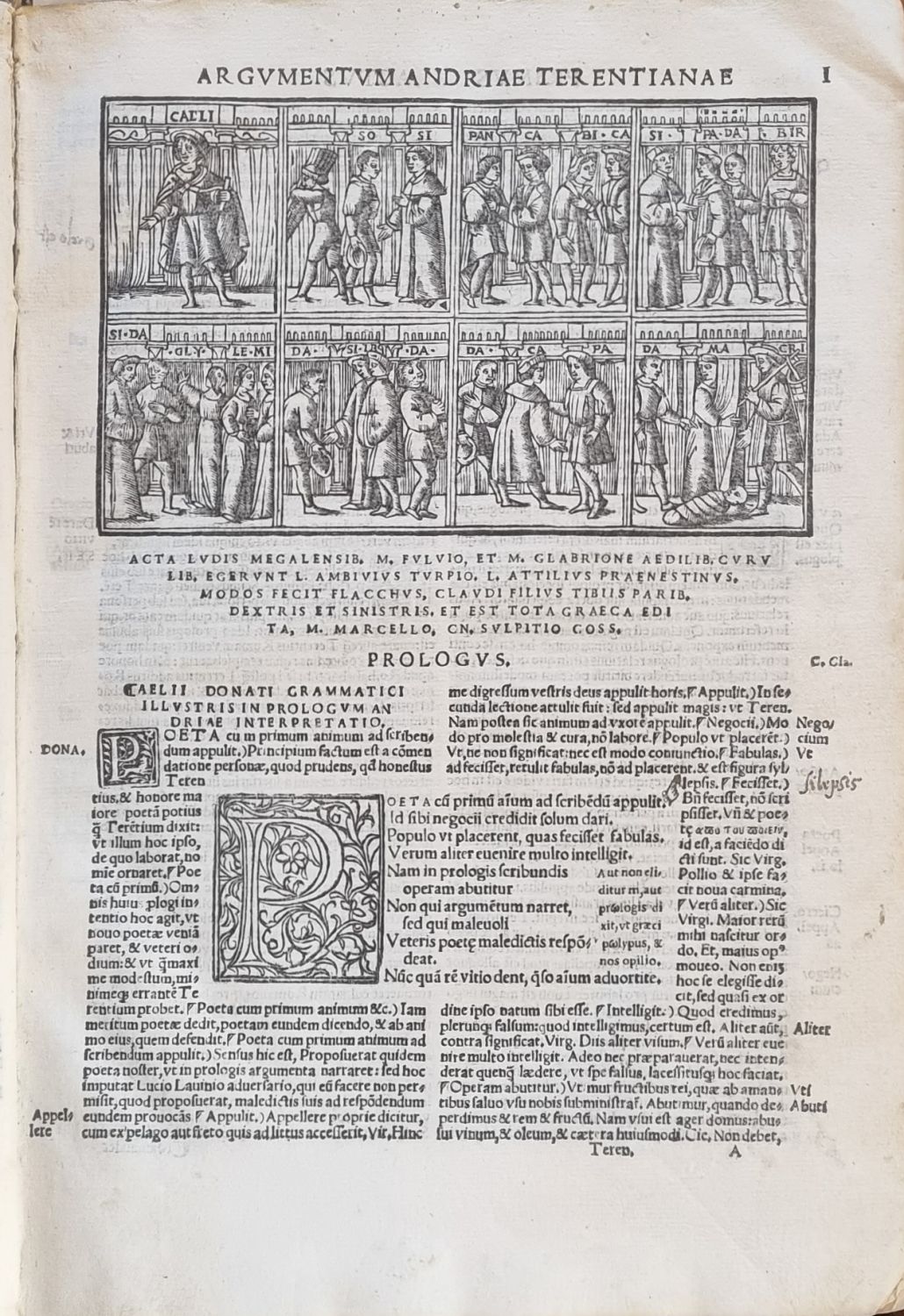 Poznámky a komentáře tištěné ve dvou sloupcích, vlastní text na bílém podkladu uprostřed přes oba sloupce. Titulní list tištěný červeno-černě a zasazený v borduře zdobené rostlinným ornamentem a delfíny po stranách. Konturové iniciály na rostlinném i ilustr. pozadí zalomené do výše 4-11 řádků. Živá záhlaví, římsky paginované listy, tištěné poznámky po stranách, kolofon na rubu posledního listu. V úvodu jednotlivých knih šest dřevořezů (105 x 170 mm) s ilustracemi k Terentiově textu. V úvodu předmluva Erasmova datovaná 1532, za ní index slov, následuje komentář Melanchtonův a životopis Terentia od Aelia Donata, vlastní text je opatřen komentářem Aelia Donata. <br>Dobová pergamenová vazba, zašpiněná, zkrabatělá, na přední desce chybí místy pergamen. pokryv, naražené rohy, při horním i spodním okraji chybí též. Ve hřbetu 3 vazy, hřbet popraskaný. Na přední desce torso perem psaného názvu. Na tit. listu staré vlastnické razítko zčásti setřené - pod biskupskou korunou "Procopius ? NYVTA", při vnějším okraji zčásti rozmazané staré razítko s biskupskou mitrou. Papír místy zahnědlý, oslí uši.<br>Aelius Donatus žil ve 4. století. Římský gramatik a učitel rétoriky, autor několika významných literárně teoretických děl. Jeho komentář k Terentiovi se dochoval celý až na oddíly věnované komedii "Heautontimoroumenos".<br>Publius Terentius Afer (cca 195 př.n. l. Kartágo - 159 př.n.l. v Řecku), římský dramatik a básník. Původně otrok v Římě, kde mu dle jeho původu začali říkat Afer (africký), před svojí smrtí ho Terentius Lucanus, u kterého byl otrokem, propustil na svobodu. Od té doby začal užívat jméno Terentius. Zemřel v Řecku ve třetí punské válce.