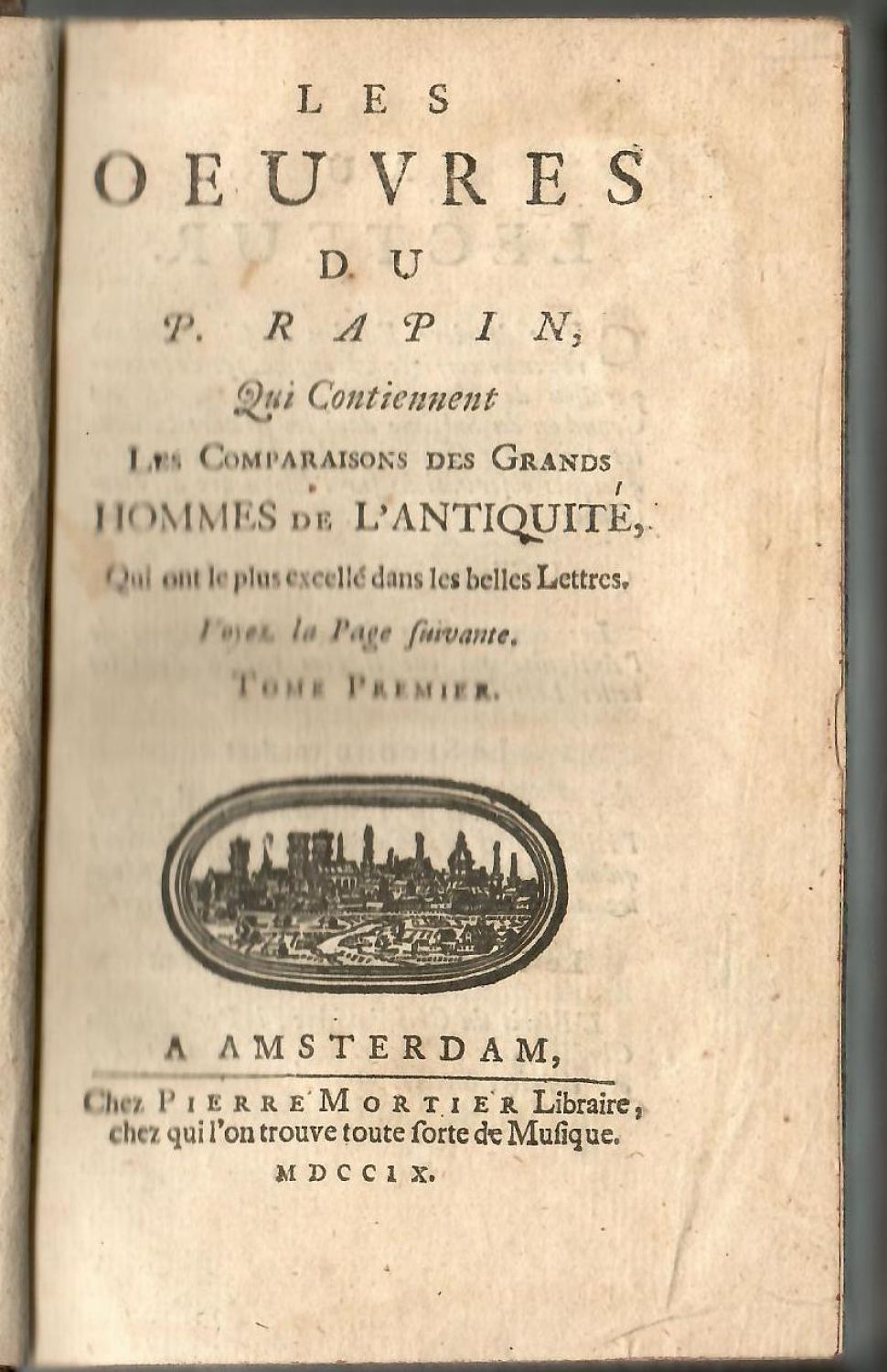 Na titulních listech dřevořezové viněty v oválném medailonu, konturové iniciály na rostlinném pozadí ve výši 4-6 řádků, viněty, živá záhlaví, tištěné poznámky po stranách, tučně tištěné versálky ve výši 2 řádků. Každý díl se samostatným tit. listem, první ... "Les Comparaisons des Grands HOMMES de L´ANTIQUITE, Qui ont les plus excellé dans les belles Lettres. Voyez la Page suivante", druhý ..."Les Reflexions sur L´Eloquence, La Poetique, L´Historie, et la Philosophie. Avec le jugement qu´on doit faire des Auteurs qui se sont signalez, dans ces quatre Parties des belles Lettres". Ve druhém svazku prvních 22 stran nepaginováno. <br>Dobová vazba z hnědé hlazené hověziny, ve hřbetu 4 vazy, ve druhém poli tlačený a zlacený název, v ostatních polích ve dvojitém jednoduchém rámečku tlačený a zlacený ornament rostlinného charakteru stříkané ořízky. Vazba ohmataná a místy lehce odřená, zlacení titulu ve hřbetu zčásti setřené.<br>René Rapin (1621 Tours - 1687 Paříž), francouzský jezuita, spisovatel a profesor rétoriky na různých jezuitských kolejích. Poesii psal v latinském jazyce a ve své době byl pokládán za předního mistra latinského verše. Francouzsky publikoval řadu kritických esejů a též několik teologických a asketických pojednání. Jeho nejznámějším dílem je posmrtně publikovaná "Historie Jansenismu", o které Saint Beave napsal, že je plná omylů. Pozdější studie různých autorů však prokázaly, že dílo je věrohodné, a že je stále platným pramenem pro historii Jansenismu. Sebrané spisy Rapinovy vyšly poprvé v Amsterdamu v letech 1709-1710 ve třech svazcích.
