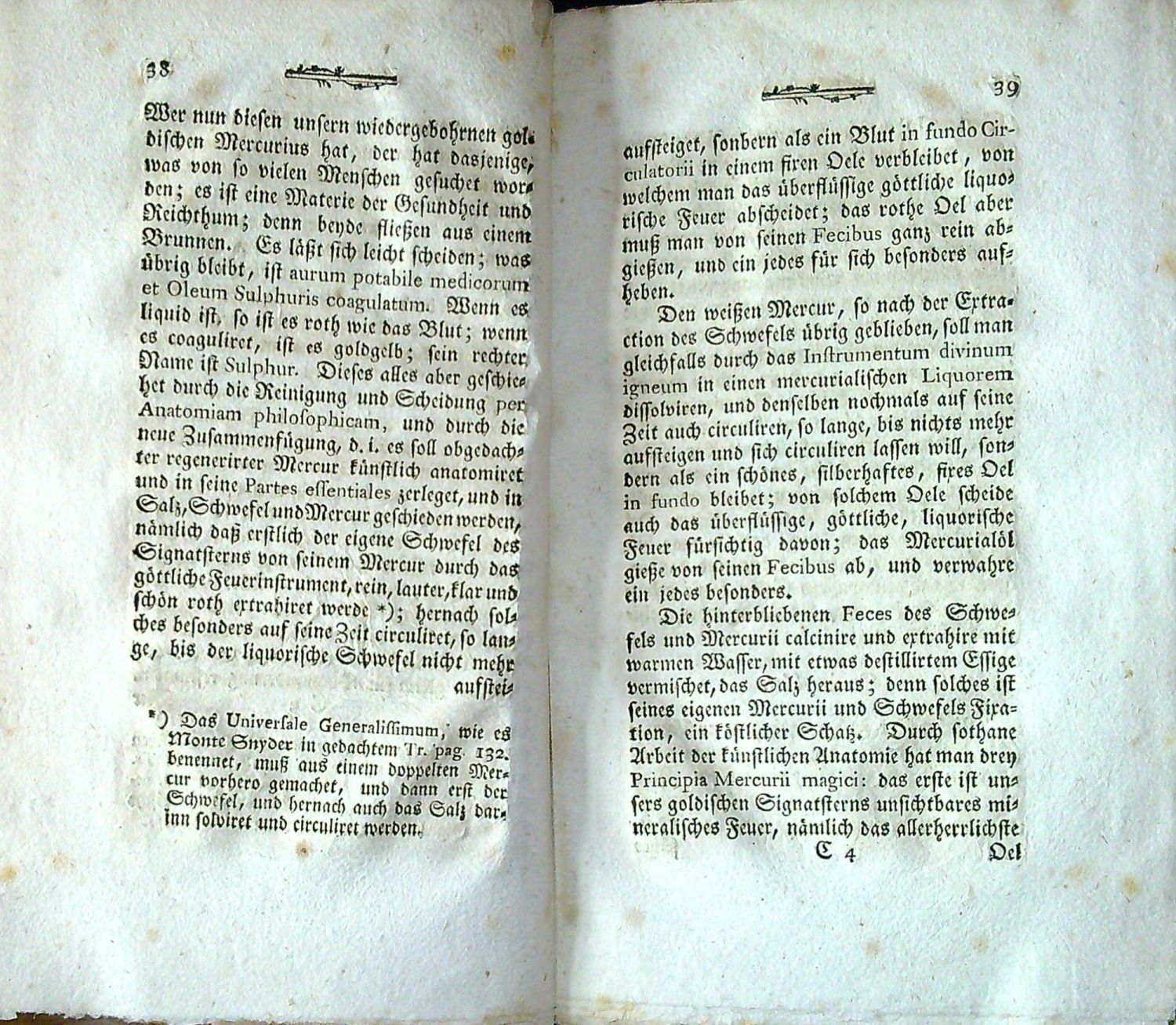 Ferchl, s. 542; Fergusson II, s. 471; Kopp I, s. 227<br>Tištěno frakturou, latinská slova antikvou, prvé dva listy nepaginovány. Na str. 11-16 otištěn údajný rukopis, nalezený v ruinách starého kostela poblíž Lüneburgu, na str. 19-32 traktát "Tinctura Medicinalis et Metallurgica", datovaný "in Schweinitz den 26. Octobr. 1692 in Oberungarn. Dein treuer ... Vater Johann Jacob Neuhauß, Medicin Doct.", na str. 33-44 pojednání "Eine Tinctur, aus der Metallen Schwefel und Salze zu machen", končící textem: "Geschrieben in meiner Hütte und kleinen Zelle, Anno 1782. Der Herausgeber, Iamimah koranhapuCH". - Dobová nezdobená obálka z modrošedého papíru, při horním okraji hřbetu černým inkoustem věcný název a datace tisku, níže stopa po štítku; obálka zašpiněná, konce hřbetu mírně nantržená, oslí uši, průběžně hnědé skvrny. Na tit. listu nečitelný vlastnický přípis z konce 18. století a razítko námi neurčené lóže.<br>