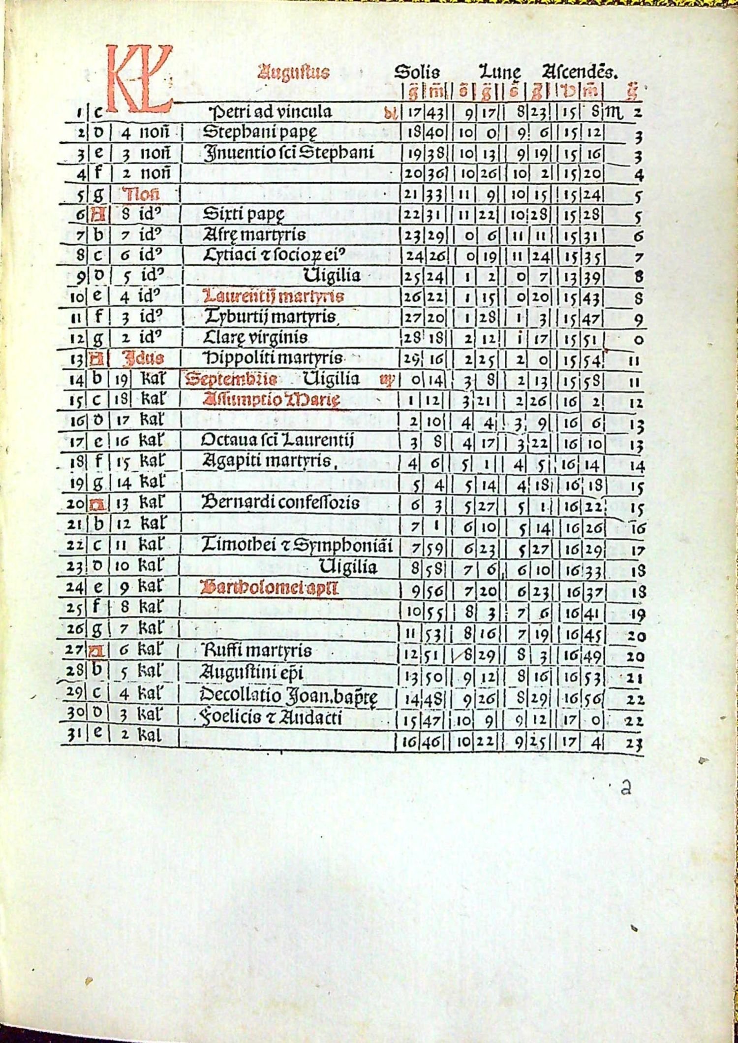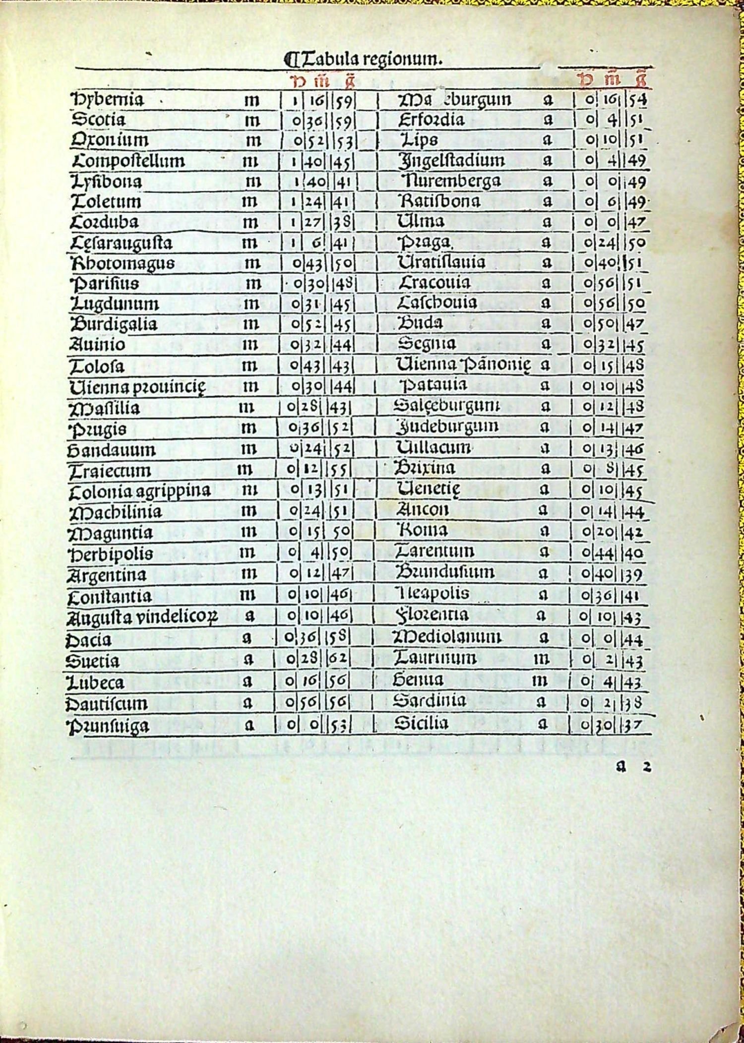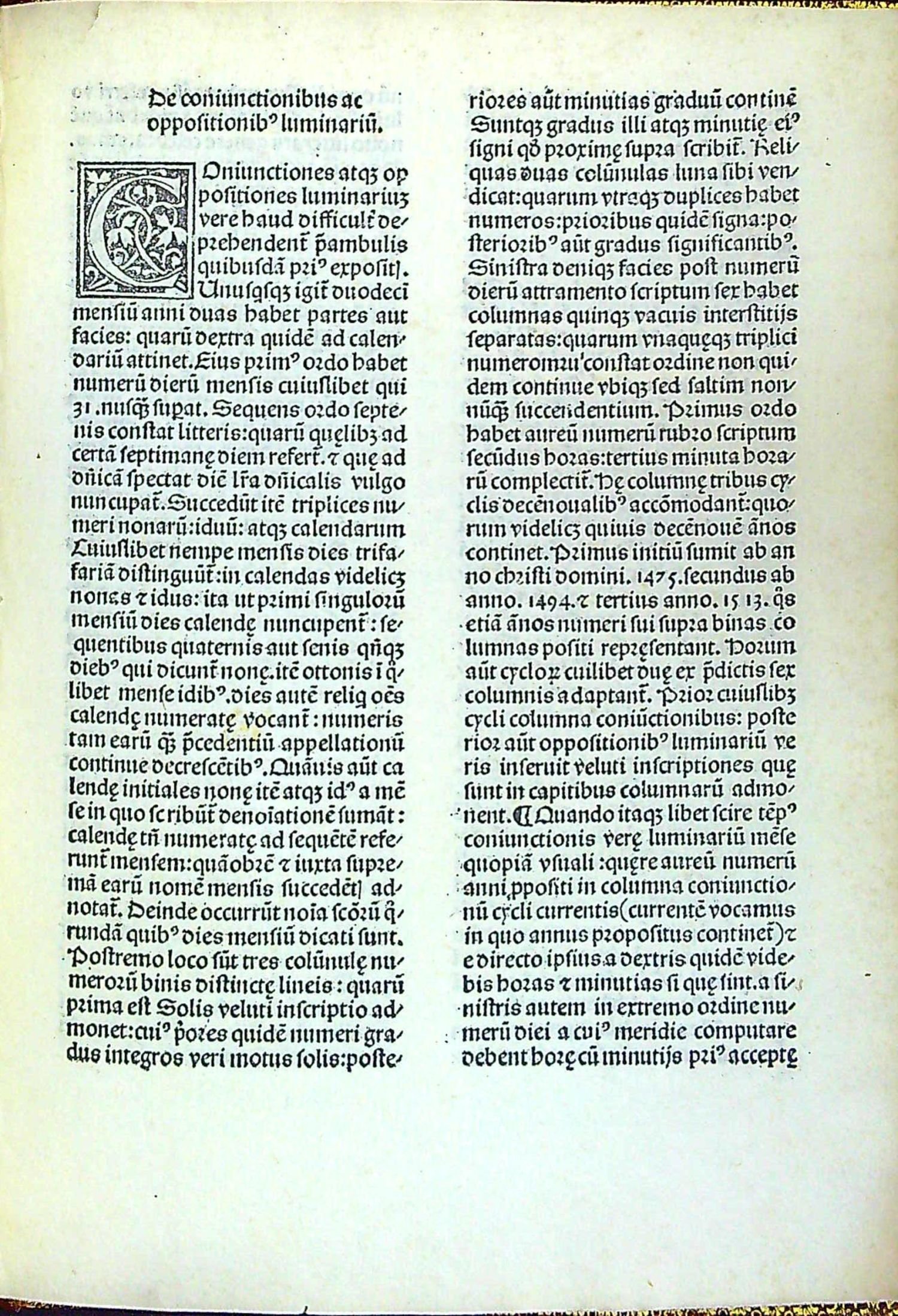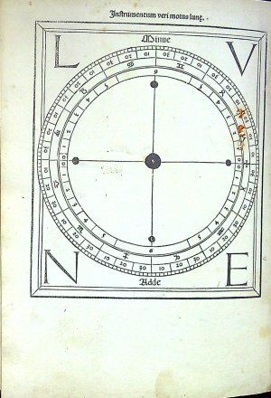 Červeno-černý tisk rotundou, titulní list v dřevorytové borduře zdobené ornamentem, konturové iniciály na ornamentálním pozadí zalomené do výše 6 řádků, na tit. listu do výše 12 řádků. Na foliích b4 verso až b8 recto dvoubarevně tištěné vyobrazení zatmění měsíce a slunce od roku 1483 do roku 1530, astronomické tabulky. Na rubu titulním listu a jeho rubu tištěný pozdrav Regiomontanovi od Johannese Lucilia Santrittera, který zřejmě provedl i redakci vydání kaledáře. K vydání připravil Jacobus Sentinus. Na foliích c8-c12 4 celostr. dřevoryty v jednoduchém rámu s geometrickými vyobrazeními.