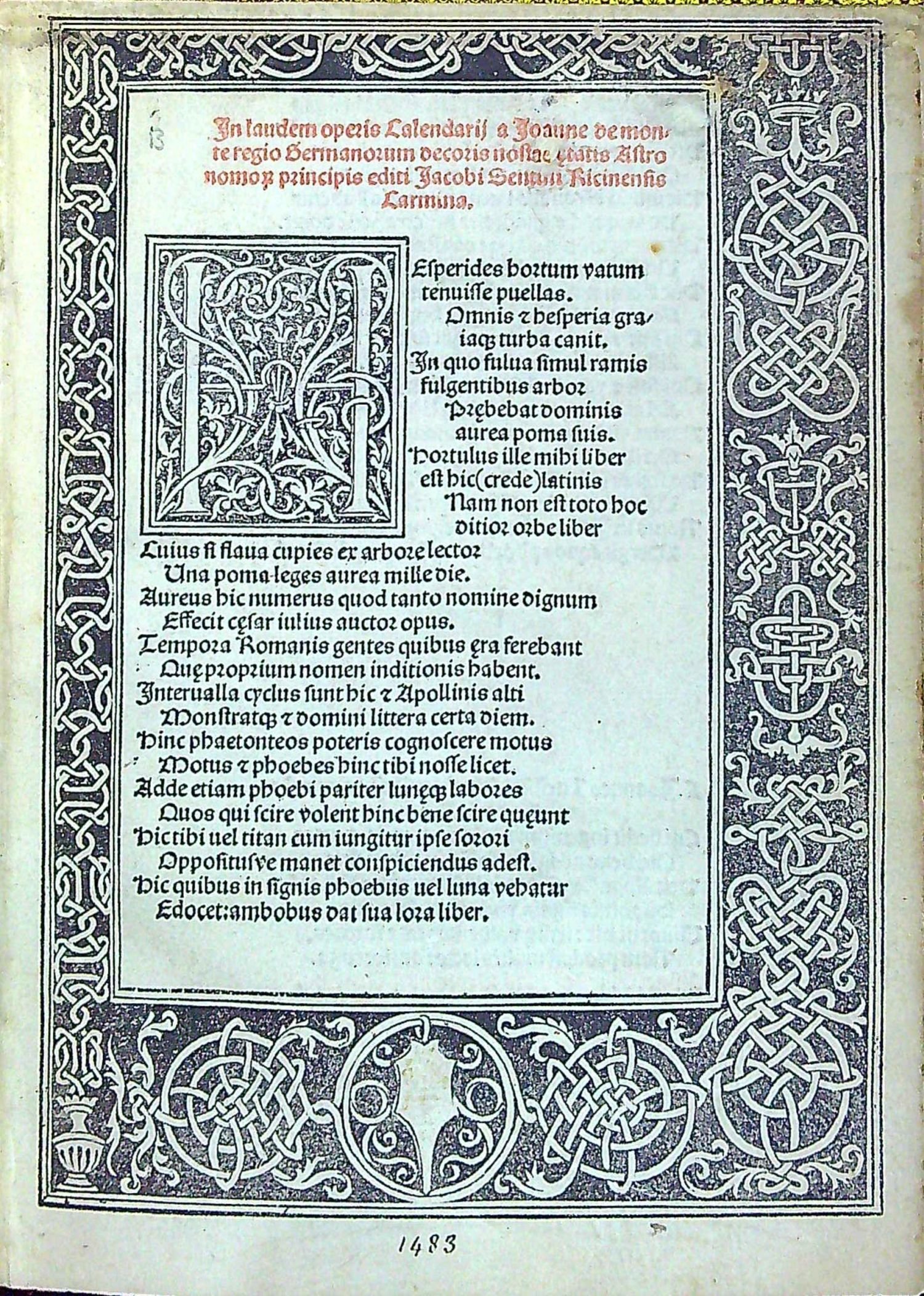 Calendarium. In laudem operis Calendarij a Joanne de monteregio Germanorum decoris nostre etatis Astronomo[rum] principis editi Jacobi Sentini Ricinensis Carmina.