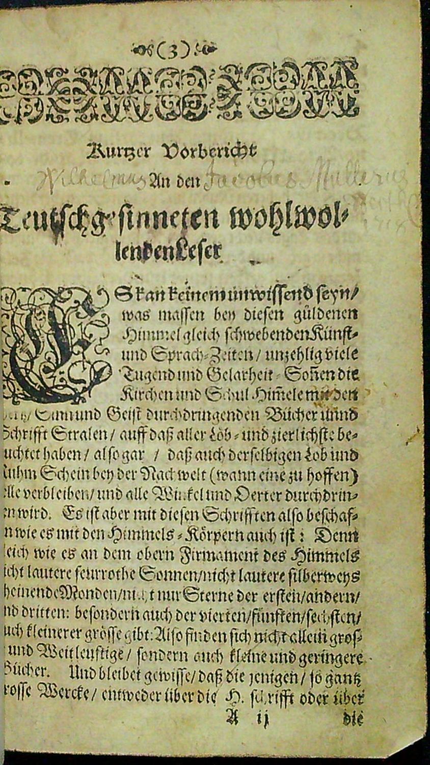 Tištěno švabachem, živá záhlaví, vstupní iniciála propletená úponky ve výši 6 řádků, plné iniciály ve výši 2-3 řádků, viněty, tiskařské ozdůbky.<br>Dobová pergamenová vazba, zašpiněná, místy odřená a při vnějším okraji potrhaná, též při spodním okraji hřbetu potrhaná, na předním přídeští rkp. poznámka perem z roku 1884 a novější záznam tužkou od Jiřího Šalamouna s údaji o vydání knihy, na foliu A-II vlastnický přípis z roku 1718 "Wilhelmus Jacobus Mullerus". Titulní list chybí (nahrazen digitální kopií - na jejím rubu podpis Jiřího Šalamouna tužkou). Chybí strana 151-152 a poslední čistý list. Strana 67 v horní třetině utržená od knižního bloku, strana 177-178 při horním okraji lehce proděravělá, strany 185-196 při vnějším okraji lehce pomačkané. Papír zahnědlý. - Druhé Wildeho vydání populárních příběhů o lišáku Reynardovi, které vznikaly ve Francii již od 12. století a knižně byly vytištěny poprvé v anglickém jazyce roku 1481. V této barokní zveršované podobě vyšlo německy poprvé roku 1650 a v tomto vydání bylo rozšířeno o řadu veršů.