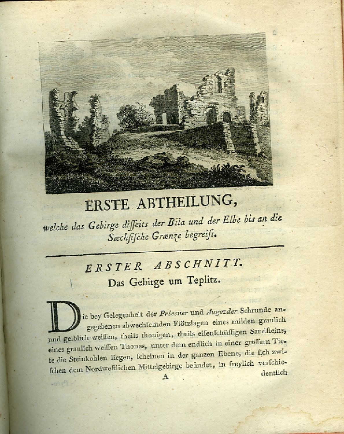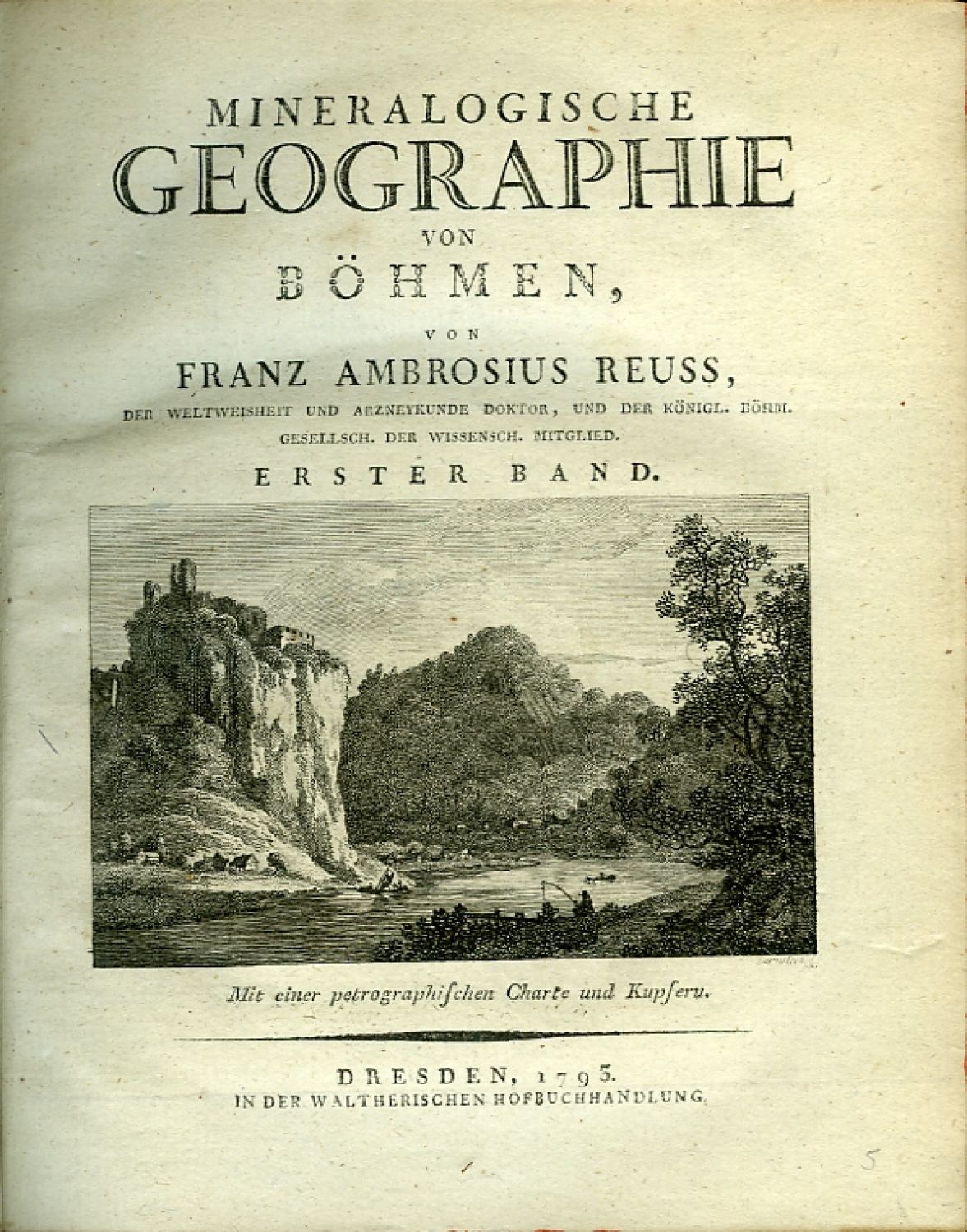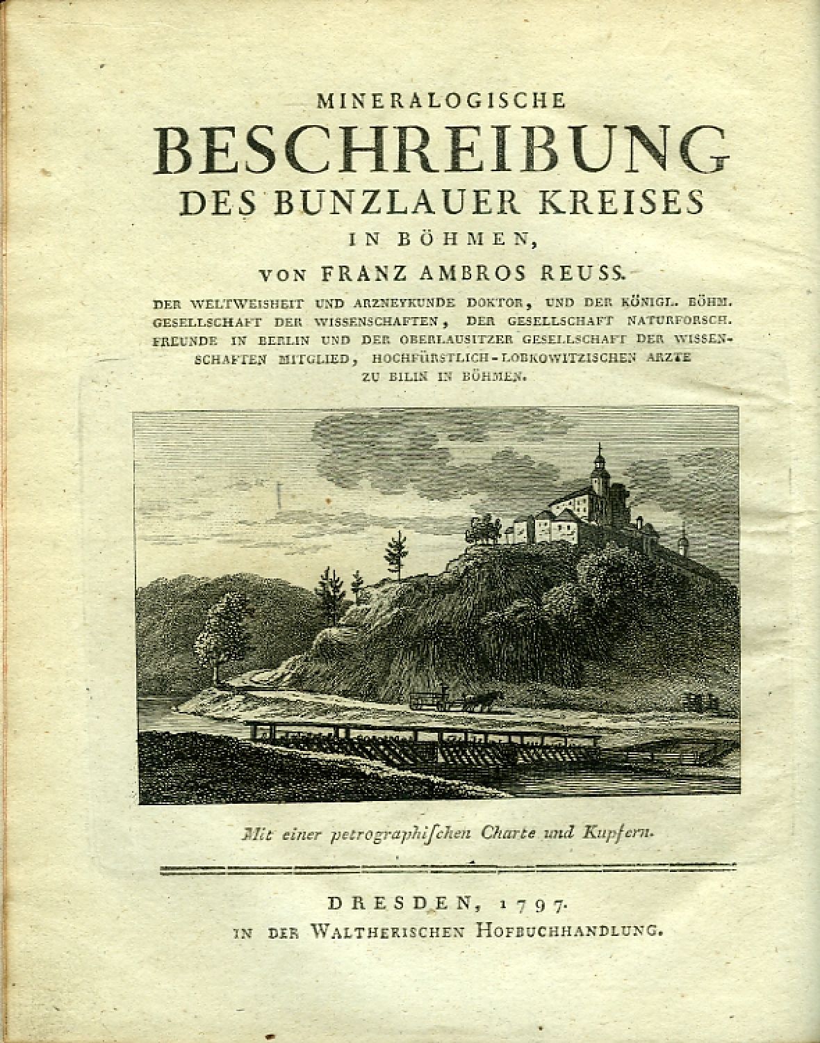 Antikva, tištěné poznámky pod čarou, živá záhlaví, ozdobné linky. - Jednotné dobové polokožené vazby s kartonovými deskami potaženými žlutě barveným máčeným papírem, kožený hřbet a nárožnice, ve hřbetu 5 vazů, ve druhém poli obou dílů původní hnědý kožený štítek s tlačeným a zlaceným názvem, ve třetím poli černý kožený štítek s vyznačením dílů, v ostatních polích tlačené ozdůbky rostlinného charakteru, červeně barvené ořízky, dobové mramorované předsádkové papíry. Vazba místy mírně odřená, lehce naražené rohy, hřbet při horním okraji 2. dílu mírně roztřepený. V textu tu a tam drobné hnědé skvrnky, přes popsané závady ve stavu dobrém. - Kompletní a velmi zřídka na trhu se objevující dílo popisující minerální a geologické poměry Litoměřického a Boleslavského kraje. <br>Franz Ambrosius Reuss (3.10.1761 Praha - 9.9.1830 Bílina), lázeňský lékař, geolog a mineralog. Původně vystudoval v Praze medicínu, roku 1782 získal doktorát. Již během studia se hlouběji zajímal o mineralogii a geologii, začal navštěvovat přednášky významného německého geologa Abrahama Gottloba Wernera na hornické akademii ve Freibergu. Později byl jmenován Franzem Josefem Maxmiliánem knížetem z Lobkowicz lázeňským lékařem v Bílině a začal zkoumat geologické složení nerostů a jejich rozmístění v oblasti Krušných hor. Roku 1800 se stal členem Akademie věd v Göttingenu a roku 1806 byl jmenován královským důlním radou.