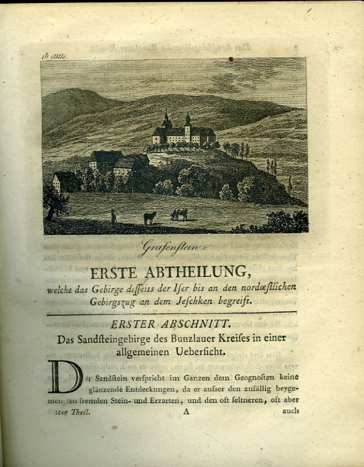 | Ilustrace: | V prvním dílu na předtitulu a tit. listu mědiryt. veduta 75 x 117 mm s vyobr. Střekova, v textu 4 veduty: na s. 1 pravděpodobně zřícenina hradu Doubravka u Teplic 70 x 103 mm, na s. 103 Hřensko(?) 75 x 115 mm, na s. 181 skalní útvar u Ústí nad Labem 73 x 105 mm, na s. 339 zřícenina hradu Hazemburk 70 x 103 mm; za textem rozkl. mědirytinová petrografická mapa Litoměřického kraje (list 380 x 490 mm, deska 340 x 415). Na předtitulu a tit. listu 2. dílu veduta boleslavského hradu 75 x 114 mm, v textu 3 veduty: Grabštejn na s. 1 (75 x 114 mm), Jizerka na s. 310 (74 x 110 mm) a Hamrštejn u Andělské hory na s. 351 (75 x 112 mm), zčásti sign. Henschcke, Dresden; mezi s. 156-157 celostr. mědirytina s vyobr. vodopádu Štolpichu u Hejnice (150 x 115 mm), za textem rozkl. mědiryt. petrografická mapa Boleslavského kraje (list 465 x 345 mm, deska 395 x 320 mm); obě mapy ryl C. Keyl dle kresby I. G. Lehmanna. |
