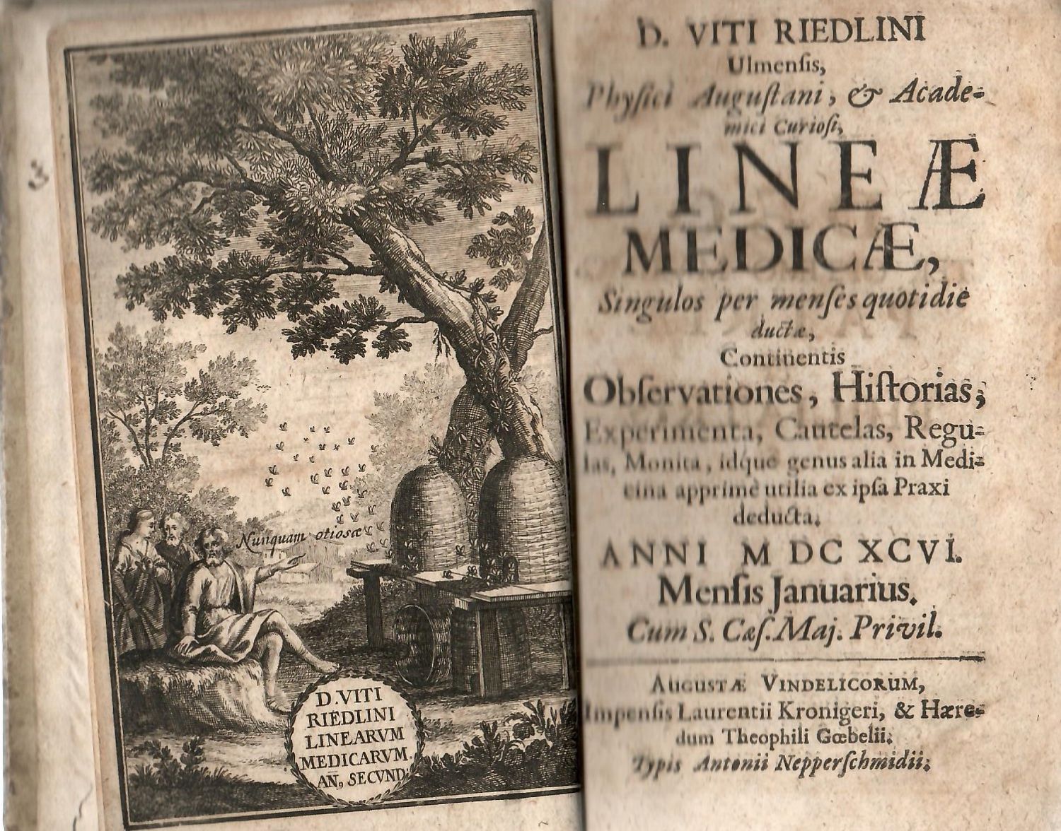 D. VITI RIEDLINI Ulmensis, Physici Augustani, et Academici Curiosi, LINEAE MEDICAE, Singulos per menses quotidie ductae, Continentis, Observationes, Historias, Experimenta, Cautelas, Regulas, Monita, idque genus alia in Medicina apprime utilia ex ipsa Praxi deducta. Ročník I. a II. (ze VI)