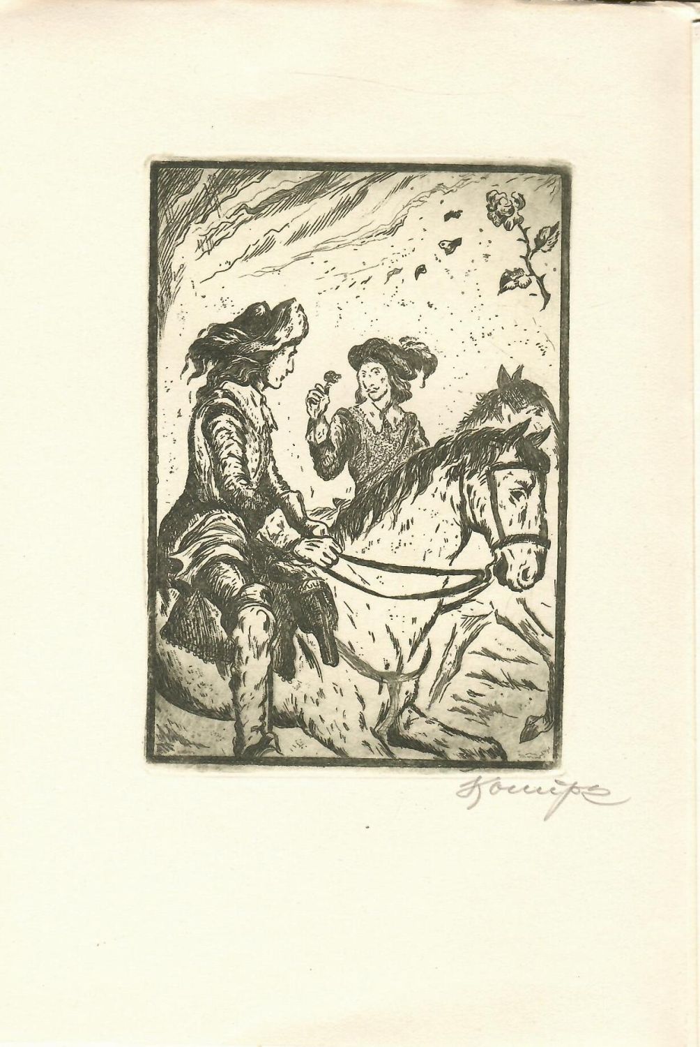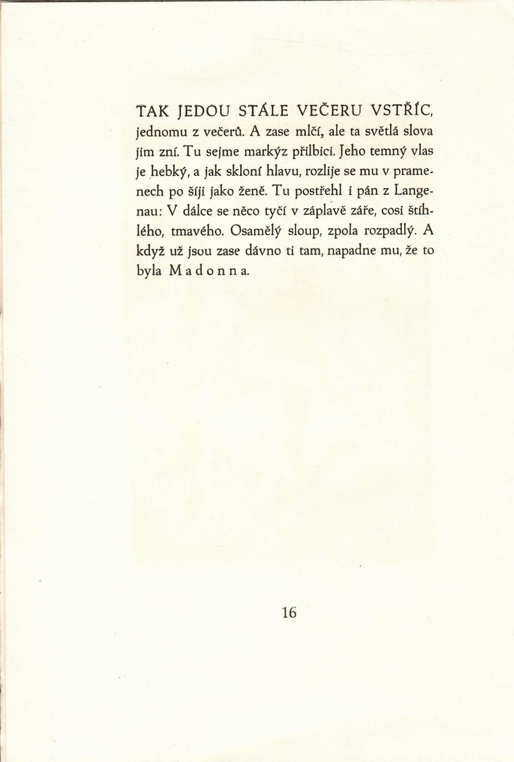 Ex. č. 60 z 200 vydaných výtisků, dva původní celostr. lepty Jana Konůpka, autorem podepsané, lepty tiskl Miro Pegrassi v Praze, v textu a na tit. straně drobné Konůpkovy ilustrace, knižní blok nerozřezaný, původní pap.obálka s chlopněmi, ve které jsou volně vloženy tiskové archy, na přední straně její oválný ozdobný medailonek s iniciálami básníkovými, v tiráži tištěné jméno prvního majitele - Václava Rudla, pod ním perem připsáno od 10. VIII. 1967 Rudolf Hlava (významný sběratel z jehož knihovny kniha pochází). Ve stavu velmi dobrém. Knižní blok nerozřezaný.