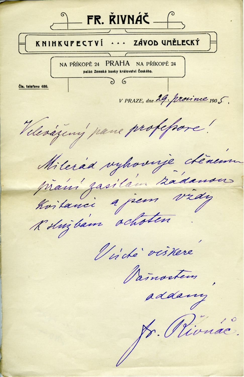 V půli přeložený list 235 x 151 mm (odtržený z dvoulistu) s tištěnou hlavičkou "Fr. Řivnáč. Knihkupectví - závod umělecký. Na Příkopě 24, Praha, palác Zemské banky království Českého", popsaný po jedné straně modrým perem. Dopis, datovaný v Praze 29.12.1905 a adresovaný nejmenovanému profesorovi, jehož ctěnému přání pisatel milerád vyhovuje a zasílá žádanou kvitanci, je podepsán Fr. Řivnáč, autorem však musí být jeho syn Antonín (1843–1917). Do knihkupectví, založeného Františkem Řivnáčem (1807–1888) r. 1848, nastoupil Antonín jako patnáctiletý r. 1858, v roce 1873 se stal společníkem a r. 1885, po odchodu otce na odpočinek, převzal vedení firmy. Závod sídlil nejprve společně s Museem království českého v Nostickém paláci Na příkopě, jenž byl v 90. letech zbořen kvůli výstavbě budovy Zemské banky a obchod se na dva a půl roku přesunul na Ferdinandovu třídu. Po dokončení stavby se Řivnáč vrátil, a otevřel v nové budově výstavné knihkupectví.