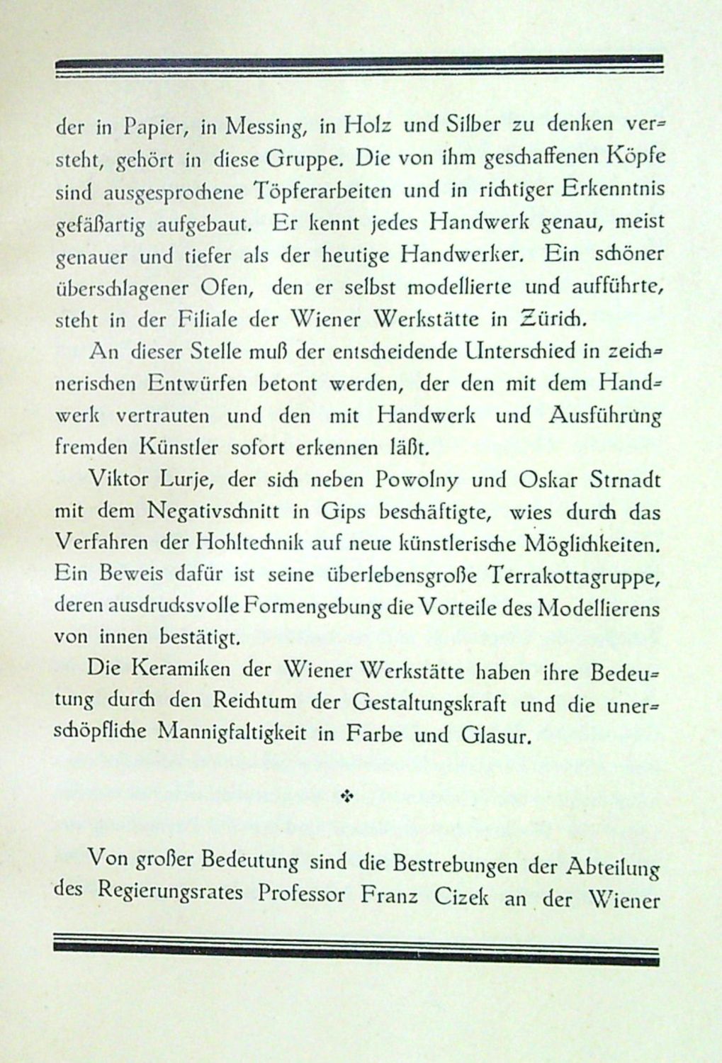 Ve front. barevná reprodukce akvarelu E. Schieleho, na straně 7-26 text nahoře a dole olemovaný trojitou jednoduchou linkou, na stranách 29-171 142 černobílých fotografických vyobrazení keramických prací předních vídeňských tvůrců (Michael Powolny, Julia Sitte, Victor Lurje, Dagobert Peche, ...). Na patitulu podpis autorův perem datovaný ve Vídni v září 1932.<br>Původní kartonové desky potažené škrobovým papírem s ilustrací na přední desce, plátěný hřbet.<br>Leopold Wolfgang Rochowanski (3.8. 1888 Zuckmantel/Zlaté Hory ve Slezsku - 13.9. 1961 Vídeň), spisovatel, básník, novinář, výtvarný kritik a historik umění. Od roku 1921 pracoval pro Prager Presse, v letech 1923/24 byl vedoucím redaktorem nakladatelství Thyrsons. V čase národního socialismu v Rakousku nesměl publikovat, po válce založil nakladatelství Agathon Verlag a k 80. narozeninám architekta Josefa Hoffmanna vydal pamětní publikaci.