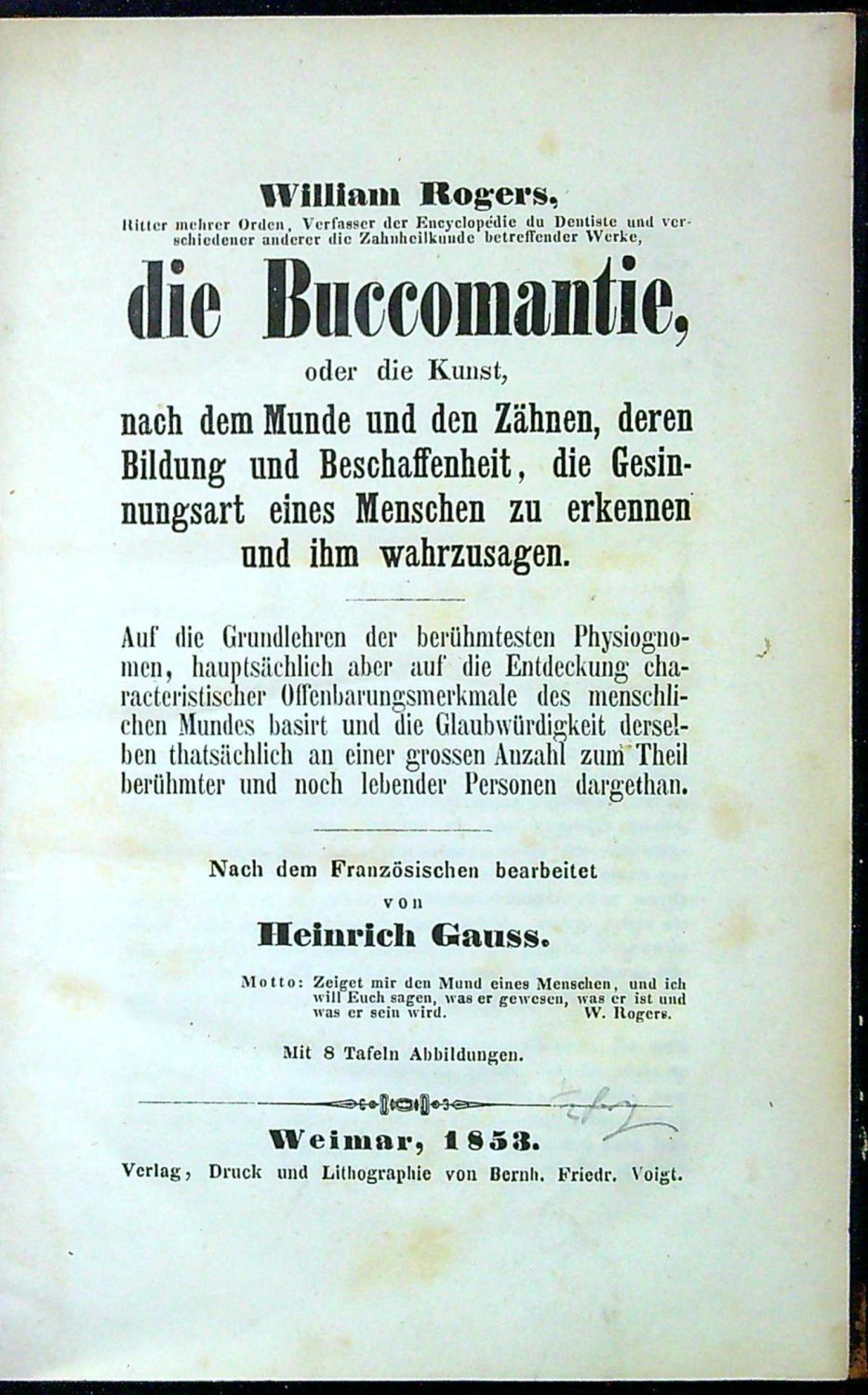 Die Buccomantie, oder die Kunst, nach dem Munde un die Zähnen, deren Bildung und Beschaffenheit, Die Gesinnungsart eines Menschen zu erkennen und ihm wahrzusagen. Auf die Grundlehren der berühmtesten Physiognomen, hauptsächlich aber auf die Entdeckung characteristischer Offenbarungsmerkmale des menschlichen Mundes basirt und die Glaubwürdigkeit derselben thatsächlich an einer grossen Anzahl zum Theil berühmter und nach lebender Personen dargethan.