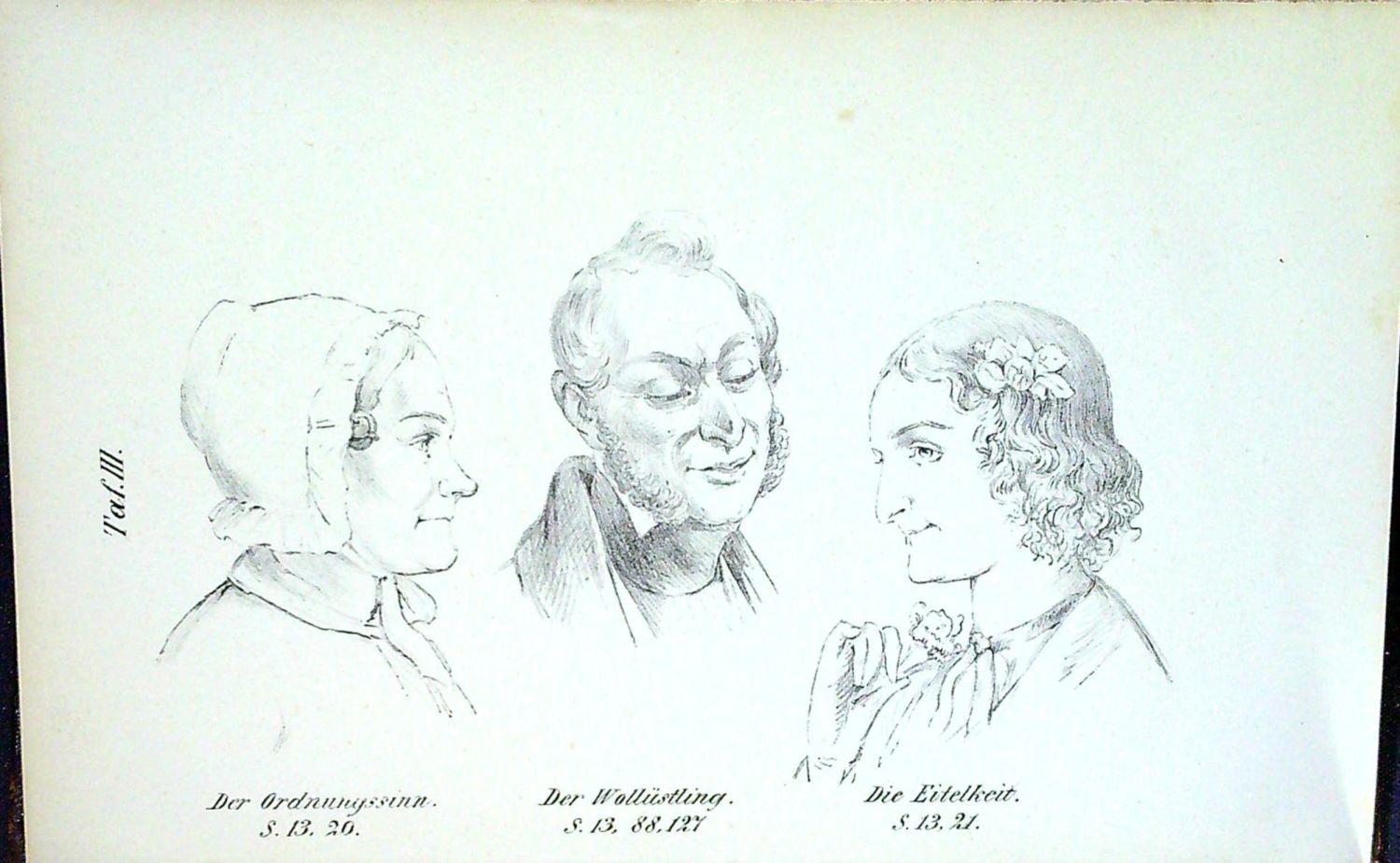 | Ilustrace: | Za textem 8 litografických tabulí s 27 vyobrazeními lidských tváří demonstrujících různé vlastnosti. |