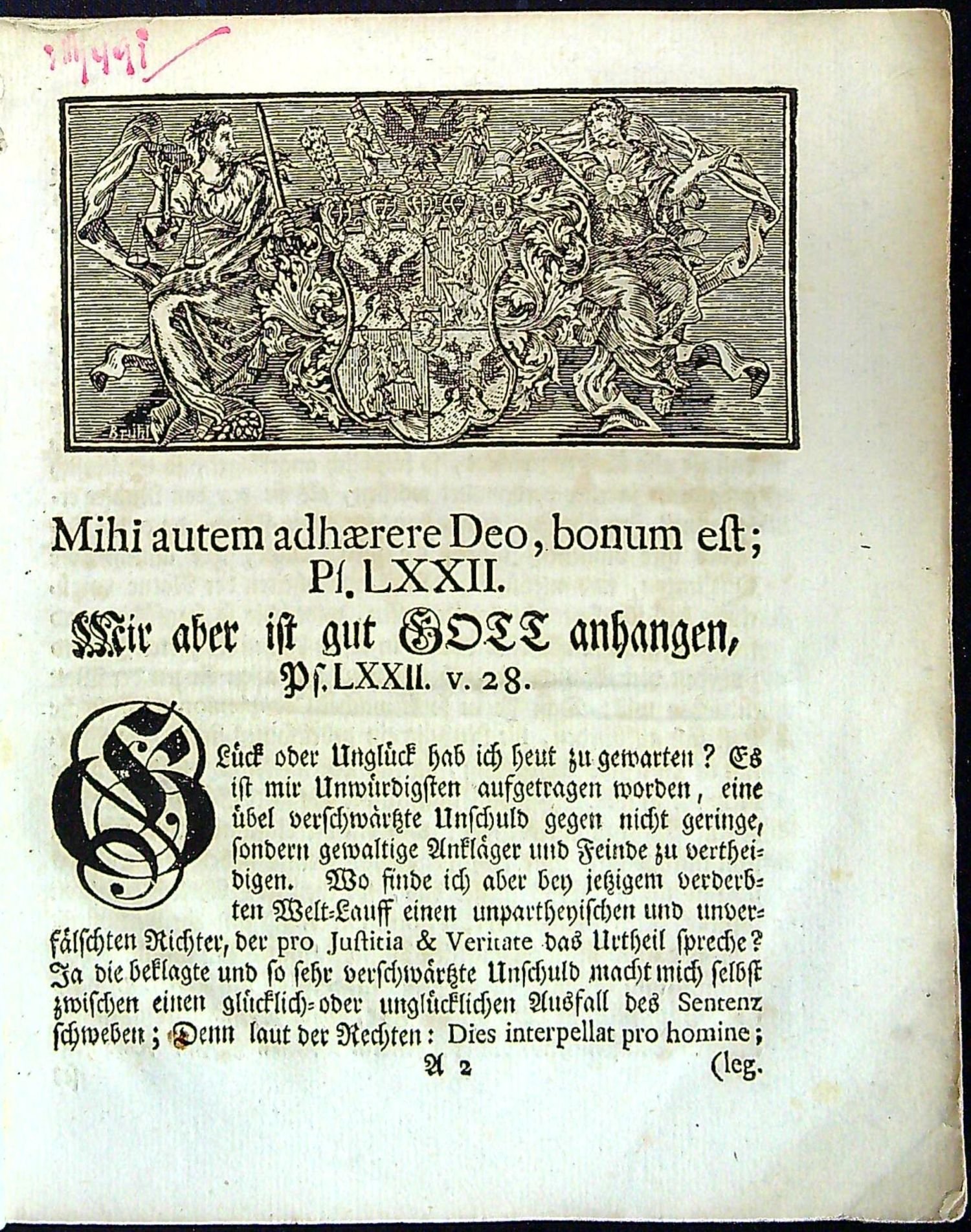 Tištěno švabachem, latinská slova antikvou, uprostřed horního okraje stran kolečko v kulatých závorkách mezi drobnými rostlinnými ozdůbkami, plné iniciály zalomené do výše 4-6 řádků, koncová viněta. Dřevořezový vlys v jednoduchém dvojrámečku (58 x 118 mm) signovaný Brühl (na čárkovaném pozadí alegorické postavy Spravedlnosti a Církve mezi kterými je erb Šporků.