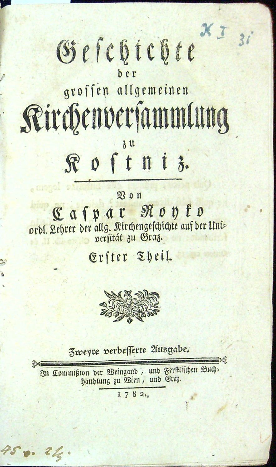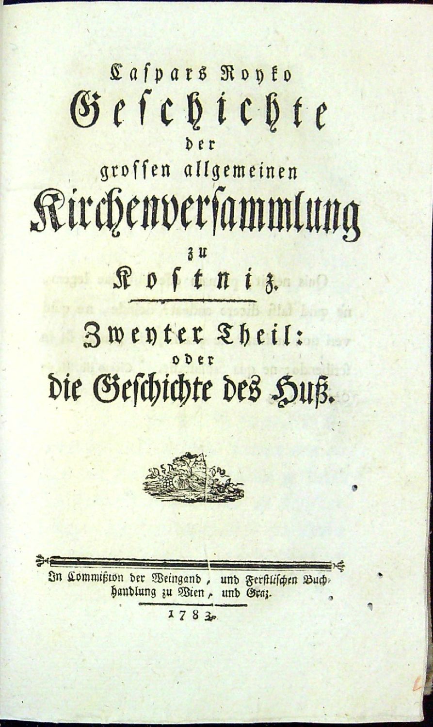 Zíbrt II,14668<br>Německý text gotikou, latinský antikvou, signatury, stránkové kustody, arabské číslování stran při horním vnějším okraji, živá záhlaví, paragrafy, na tit. listech viněty, impresum oddělené ozdobnou tyčí, poznámky pod čarou, po stranách tištěné marginálie, ozdobné linky, drobné viněty. Druhý díl s podtitulem "oder die Geschichte der Huß".<br>Dobová kartonová vazba, ohmataná, ve hřbetu místy potrhaný papír, naražené rohy, papír místy zahnědlý, od strany 239 II. dílu při vnitřním okraji až do konce cestičky od červotoče. Na rubu přední předsádky perem psaný prov. záznam z 19. století "Ex Bibliotheca Matheo S? Litomyšl", mezi str. 48-49 nalepen proužek papíru s latinským textem vztahujícím se k obsahu knihy.<br>Prvé vydání 1. svazku vyšlo roku 1780 anonymně ve Vídni, ostatní svazky pouze ve vydání jediném již pod jménem autorovým, stejně tak jako 2. vydání prvního svazku. Prvý a druhý svazek vyšly ve Vídni a ve Štýrském Hradci, další díly v Praze.<br>Kašpar Royko (1744 Maribor - 1819 Praha), katolický kněz a církevní historik, svobodný zednář a od roku 1782 profesor na pražské universitě, kde se stal později děkanem teologické fakulty a rektorem university. Ve svém hlavním díle, "Historii církevní a koncilu v Kostnici" zastává názory v duchu osvícenském a kriticky se vymezuje vůči tradičnímu pohledu na Husa a husitství katolické církve.