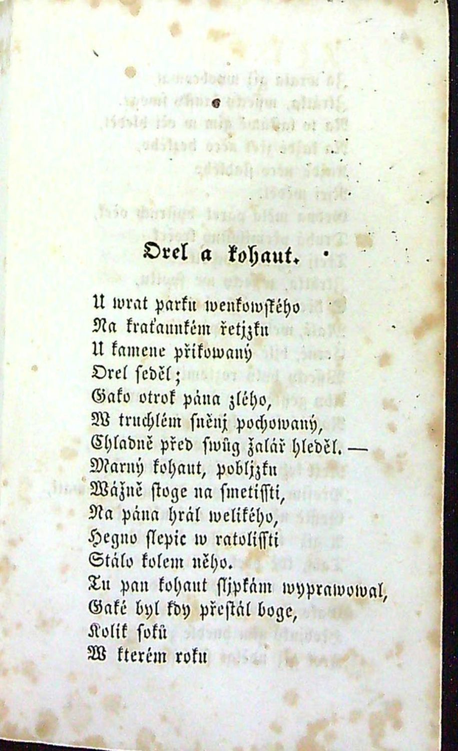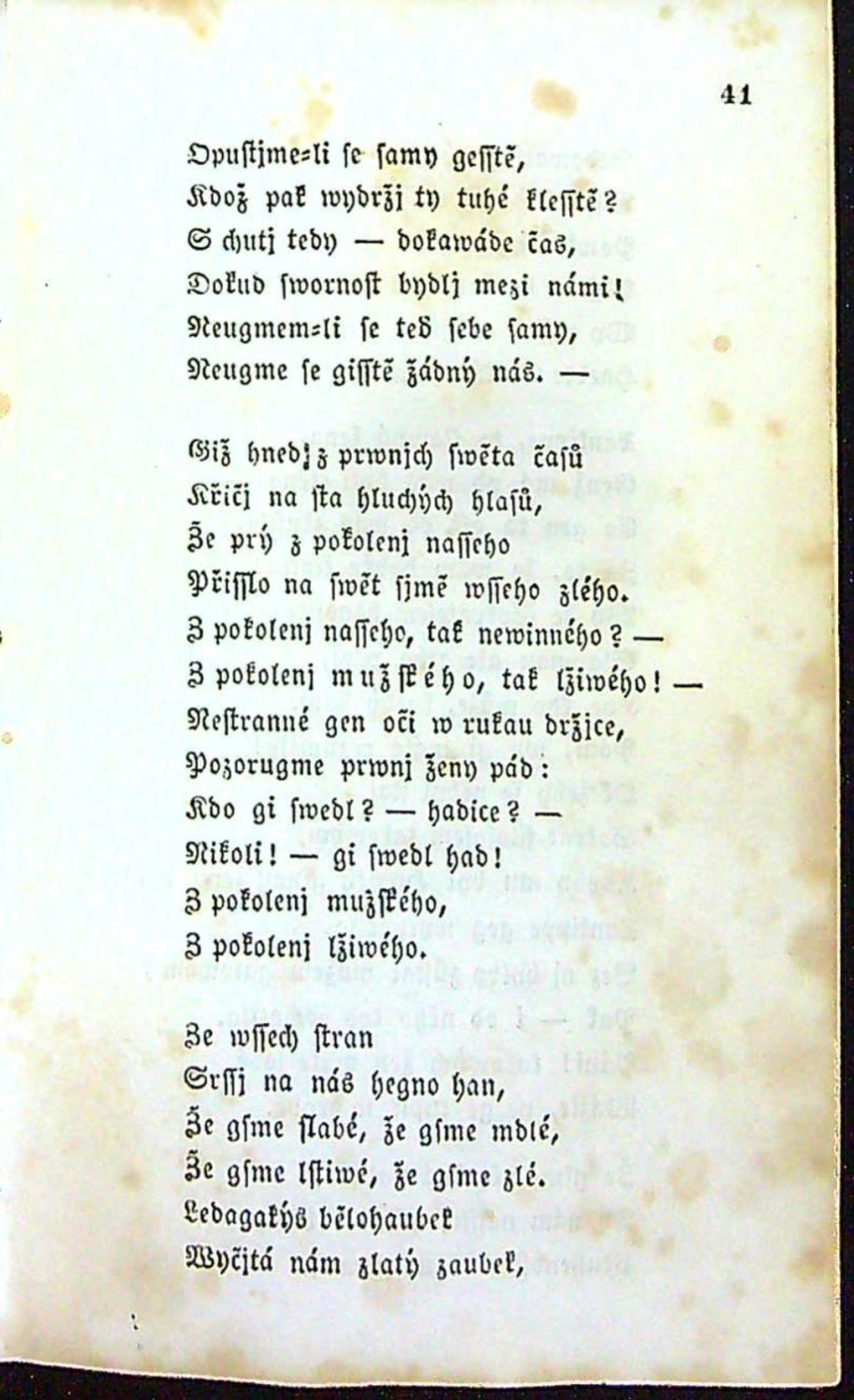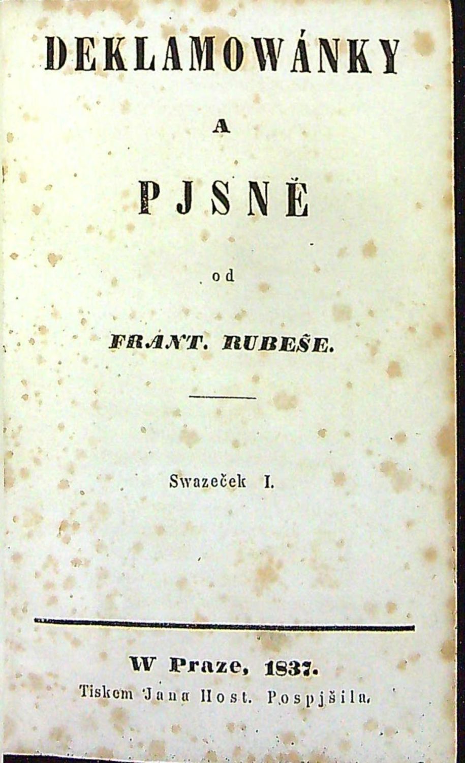 Tištěno švabachem, titulní listy antikvou. Tučně tištěné nadpisy.<br>Dobová vazba s kartonovými deskami potaženými olejovým papírem, kožený hřbet se šesti poli dělenými jednoduchou zlacenou linkou, ve druhém poli tlačený a zlacený název, ve 4. poli číselný údaj o počtu svazků. Vazba ohmataná a místy odřená, ve hřbetu kůže na přední desce podél hřbetu v horní polovině natržená, na zadní ve spodní polovině. Papír zahnědlý, místy hnědé flíčky způsobené kyselostí papíru.<br>František Jaromír Rubeš (16.1. 1814 Čížkov u Pelhřimova - 10.8. 1853 Skuteč) právník, prozaik, básník, spoluzakladatel časopisu Paleček. V roce 1848 ve svém bytě ukrýval J. V. Friče, stíhaného úřady. - V úvodu 5. svazku deklamovánek "Každý chce být trochu živ -<br>A to není žádný div!<br>Každý je tu jen co host,<br>A má přec jen nejraději sebe;<br>.....
