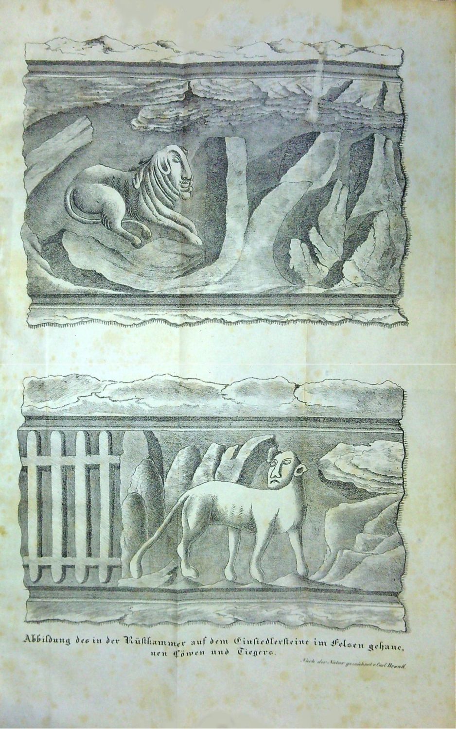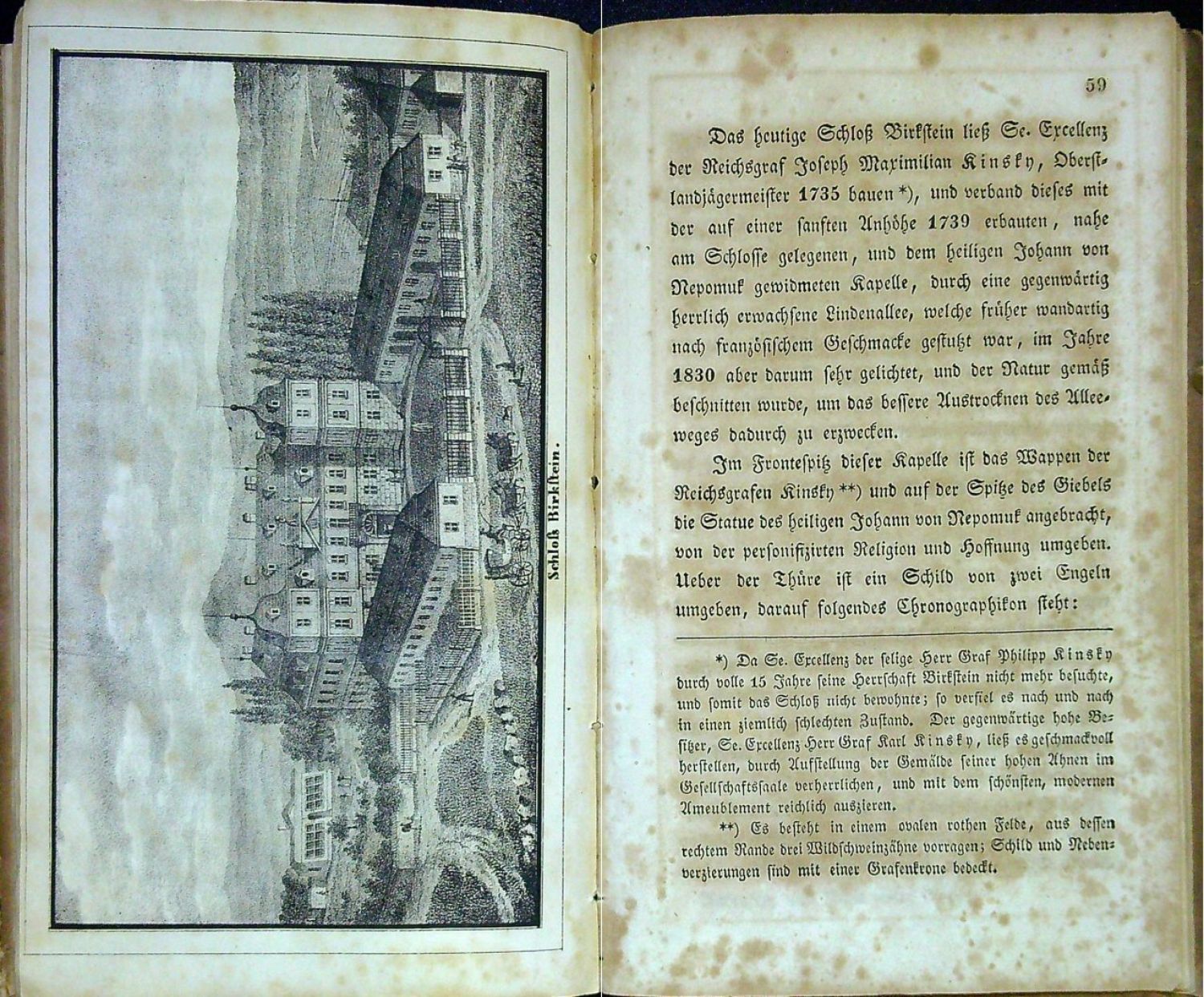 Německý text gotikou, latinská slova antikvou. Mezi str. 32-33 rozkládací litografická příloha podle kresby Carl Brantla zobrazující lva a tygra údajně kdysi vytesaných do skály u hradu Sloupu, mezi str. 58-59 litografická příloha s vyobrazením barokního zámku ve Sloupu, který vybudoval mezi lety 1730-33 rod Kinských. <br>Původní kartonová vazba, značně odřená, ve hřbetu potrhaná, naražené rohy, papír zahnědlý, místy hnědé skvrny a mapy. Chybí kolorovaná rytina s vyobrazením skalního hradu Sloupu.