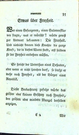 Tištěno švabachem, uprostřed horního okraje stran dvojitá mizící linka,, mizící jednoduché a zvlněné linky, koncová viněta. Na nečíslované straně 45 mezititul "Zugabe oder Anhang zum Taschenbuch für Freymäurer" a na listu následujícím "Zugabe aus der höhern Philosophie zum Nachdenken". Tištěno na ručním rýhovaném papíře.