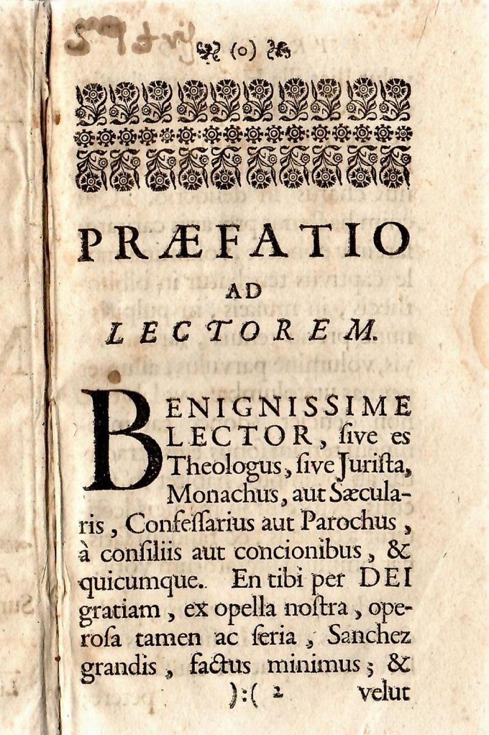 Dřevořezové vlysy a ozdobné lišty z rostlinných ornamentů, vstupní konturová iniciála na rostlinném pozadí zalomená do výše 6 řádků, živá záhlaví, tištěné poznámky po stranách.<br>Dobová pergamenová vazba s vázacími tkanicemi, při horním okraji hřbetu ručně psaný název hnědým inkoustem, barvené ořízky. Vazba ohmataná a zašpiněná, při horním okraji hřbetu natržená, papír zahnědlý, místy drobné skvrnky.<br>Thomas Sanchez (1550 - 1610), byl španělský jesuita a významný kazuistik. Nabízené dílo zařadila římská kurie mezi klasická díla o manželství, zatímco třetí svazek jeho "Disputationes" byl na seznamu zakázaných knih.
