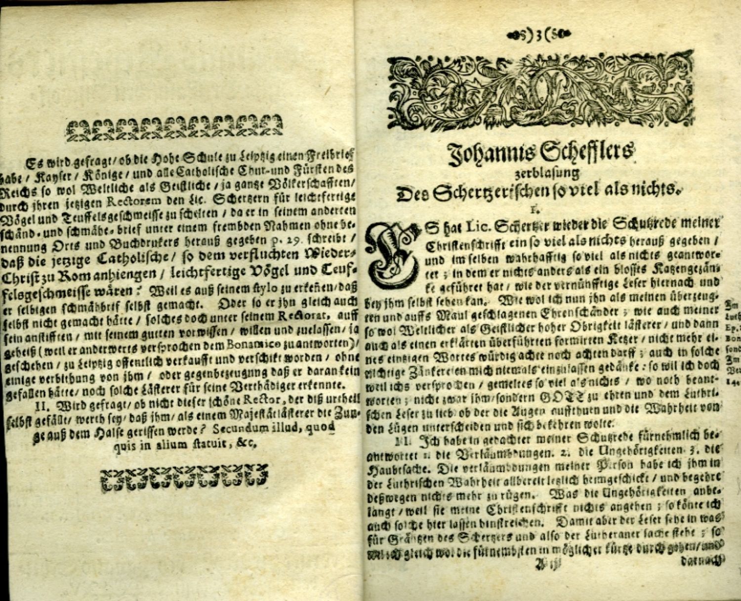 Worldcat Catalogue eviduje pouze 2 exempláře v německých knihovnách (Mnichov a Wolfenbüttel).<br>Živá záhlaví, tištěné poznámky po stranách, pásové vlysy a lišty, iniciály ve výši 3-5 řádků, na straně 45 viněta se sv. Jiřím na koni zápasícím s drakem v rozevřeném věnci, koncová vinětka. <br>Bez vazby, na zadní straně jako obálka přilepený papír z počátku 20. století. Titulní list je při vnějším okraji v šíři cca 25 mm ustřižený, okraje stran 5-6,13-14,31-30,45-46,53-54 jsou ustřižené při spodním okraji cca v 15 mm (po signaturu a stránkový kustod). Na tit. listu provenienční přípis jesuitské koleje v "Comot" (ustřiženo), pravděpodobně v Chomutově, při spodním okraji vlevo dole vlastnické razítko A.V.<br>Johann Scheffler (1624-1677 Vratislav), známější pod svým pseudonymem Angelus Silesius, slezský, německy píšící barokní básník, lékař a teolog. Jeho otec byl polským luteránským šlechticem, Johann roku 1653 konvertoval ke katolictví, vstoupil do Řádu menších bratří, po konverzi přijal jméno Angelus a přídomek Silesius. Jeho nejznámějším dílem je "Poutník cherubínský".