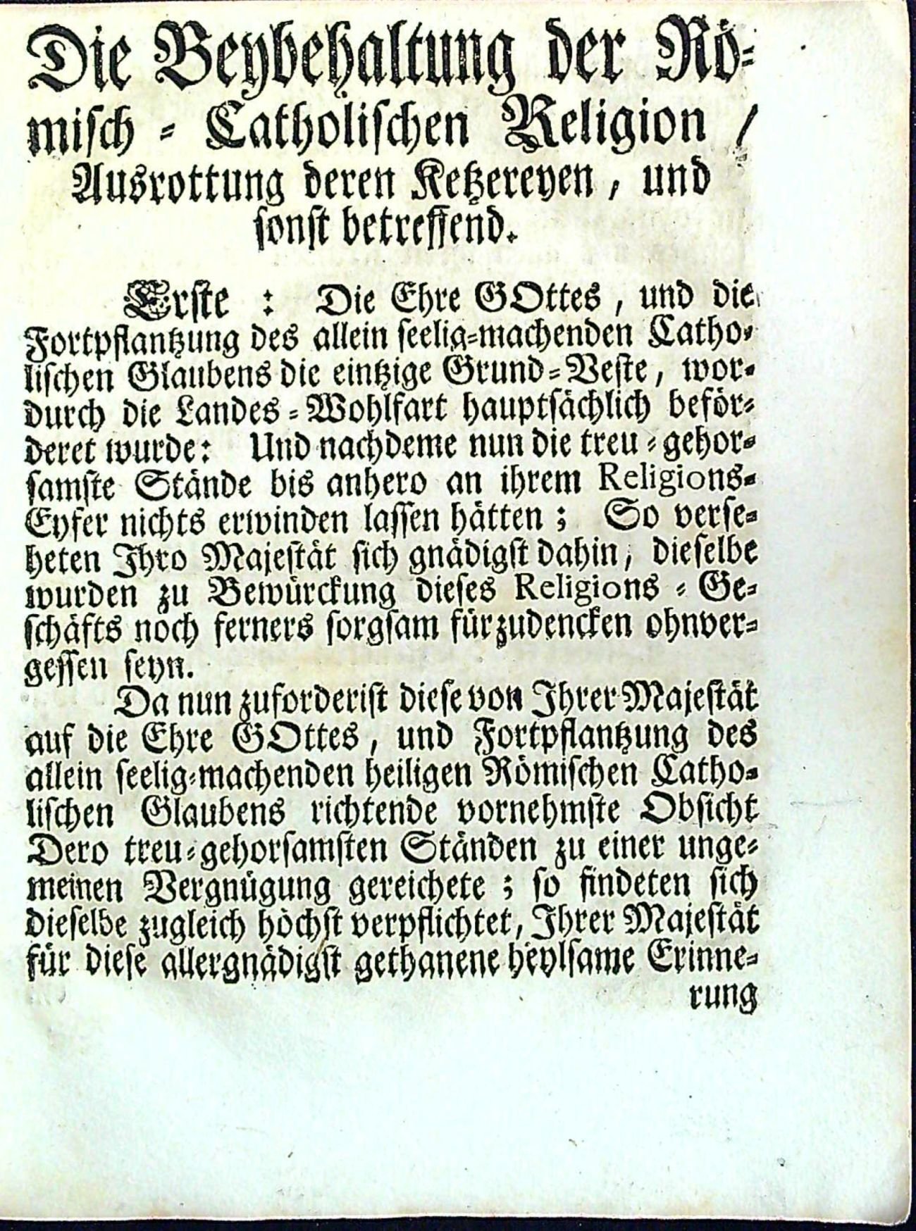 Tištěno švabachem, latinská slova antikvou. Na titulním listu mědiryt. erb se symboly Zemí Koruny české, na rubu erb Moravského markrabství. Na foliu E4b mědirytinový erb Wenzla Maxmiliana von Kriesch (editora), vstupní mědirytinový vlys. plná iniciála propletená úponky zalomená do výše 5 řádků, za textem rozkládací příloha. - Chybí poslední list s erbem Johanna Zablatzkyho von Tuleschitz (na jeho rubu bylo vytištěné impresum). Rozkládací příloha na rubu při vnitřním okraji podlepená (9 x 4 cm).