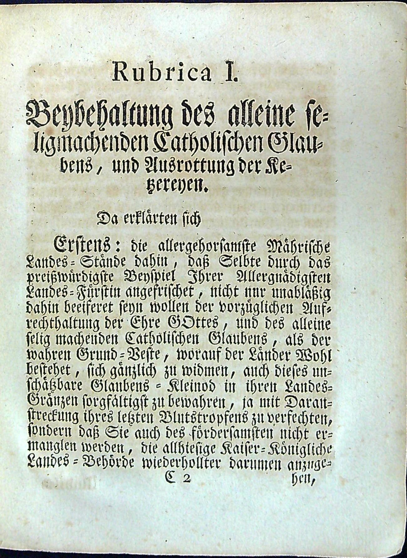 Tištěno švabachem, latinská slova antikvou. Na titulním listu mědiryt. erb se symboly Zemí Koruny české, na rubu erb Moravského markrabství, na líci posledního listu erb editora Heinricha Xavera Hayecka von Waldstätten a na rubu erb Josepha Franze von Pillersdorf. Vstupní mědirytinový vlys, plná iniciála propletená úponky zalomená do výše 4 řádků.