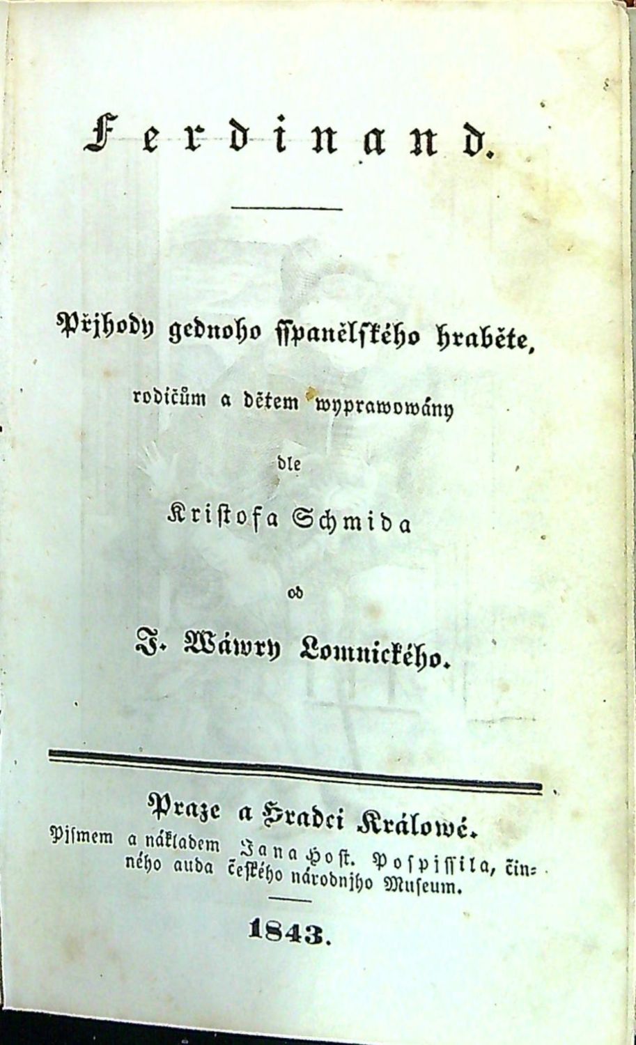 Ferdinand. Přjhody gednoho sspanělského hraběte, rodičům a dětem wyprawowány dle Kristofa Schmida od J. Wáwry Lomnického.