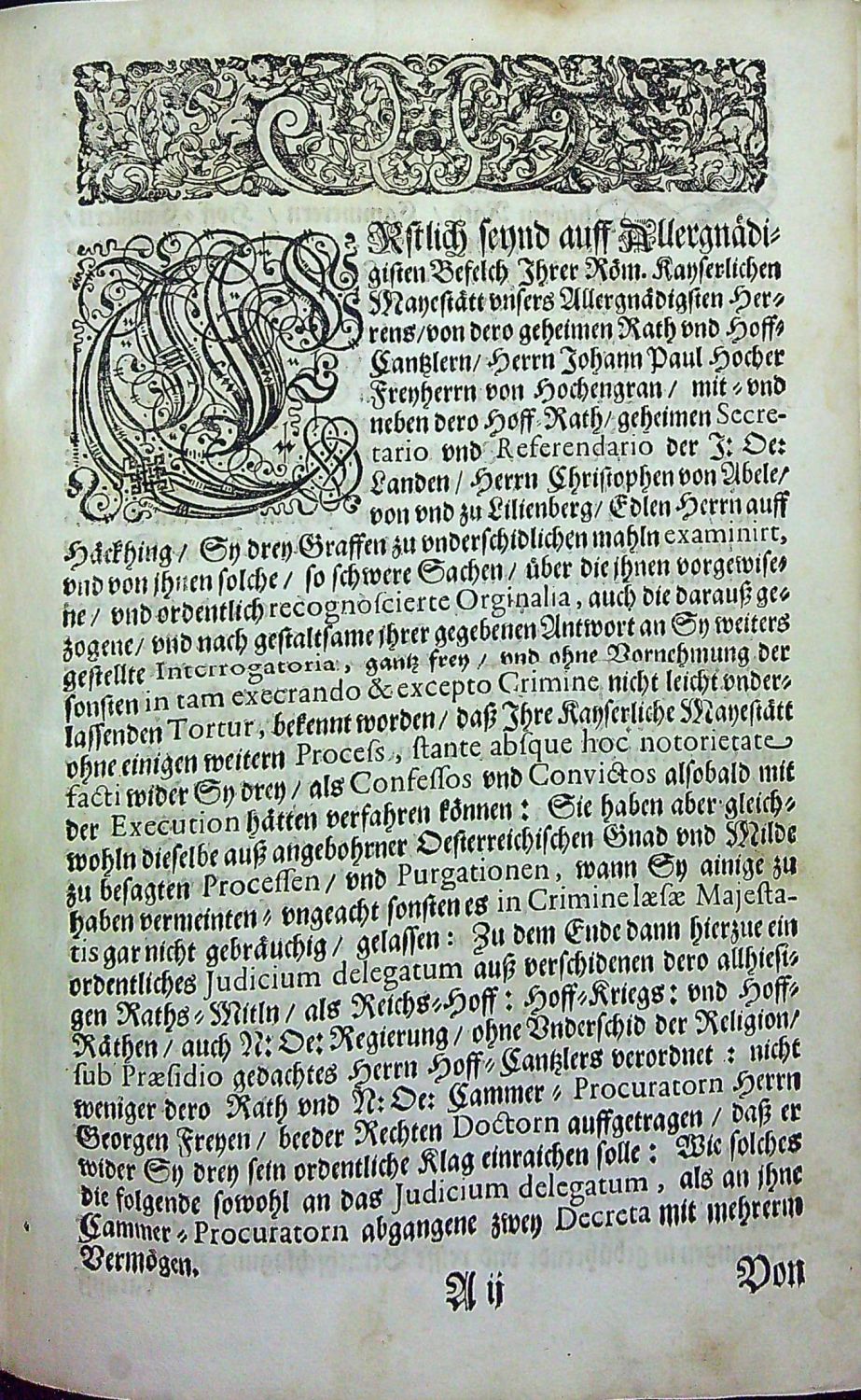 Tištěno švabachem, latinská slova antikvou, konturové iniciály propletené úponky zalomené do výše 7-10 řádků, plné iniciály propletené úponky zalomené do výše 4-7 řádků, pásové vlysy. Na prvých 28 nepaginovaných listech text, na dalších 12 listech text k rytinám.<br>+ přívazek: "Aussführliche vnd warhaffte Beschreibung Wie es mit dem Criminal-Process Vnd der darauff zu Grätz den I. December 1671. erfolgten EXECUTION Wider Johann Erasam von Tätenpach/ Eigentlich Hergangen". Wienn, Mattheo Cosmerovio, 1672, 13 listů. Tištěno švabachem, latinská slova antikvou, na tit. listu tištěné erby, vstupní konturová iniciály propletená rostlinnýmiu úponky zalomená do výše 7 řádků, plné iniciály propletené úponky zalomené do výše 5-7 řádků, pásové vlysy, viněta. <br>První dílo je popis procesu vedeného s Františkem III. Nádasdy, Petrem Zrinským a Františkem Kryštofem Frankopanem, organizátory spiknutí proti Habsburkům.