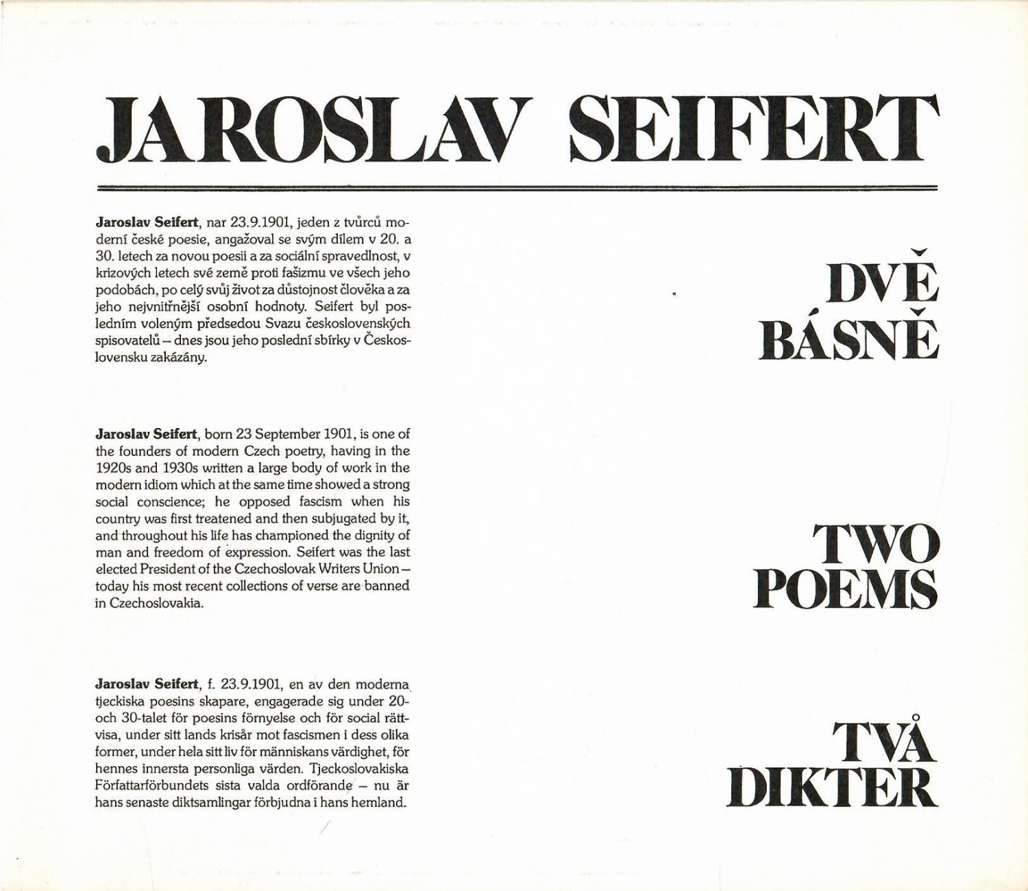 Básně Listopadový déšť a Úryvek z dopisu s anglickým překladem Ewalda Oserse a švédským Josefa Brettschneidra a Harry Järva, vydané k 80. narozeninám básníka. Graf. úprava Kicki Askelin a Jan Kristofori. - Ručně čísl. ex. 489/999. Obálka s faksimilí autorova podpisu v ohybu vybledlá a prodřená, listy čisté. Desky ve hřbetu roztrženy a zcela odděleny od knižního bloku.