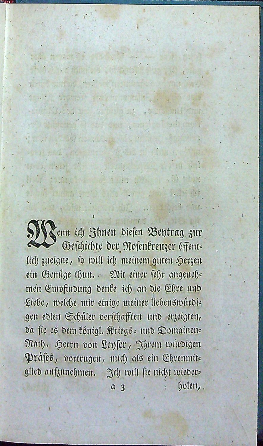 Německý text švabachem, latinský antikvou. Místy sazba ve dvou sloupcích, tištěné poznámky pod čarou. Uprostřed horního okraje stran mizící dvojitá linka, tučně tištěné plné iniciály ve výši 2 řádků, vstupní pásový vlys, na konci mizící ozdobná tyč.<br>Kartonová vazba z konce 19. století, přes horní i spodní okraj hřbetu přelepeny staré pap. knih. štítky. Papír místy zahnědlý. Na tit. listu staré razítko stuttgartské zednářské lóže "Drei Cedernů.<br>Johann Salomo Semler (18.12. 1725 Saalfeld - 14.3. 1791 Halle) německý církevní historik a komentátor Bible, kritik církevních dogmatů, některými považovaný za otce německého racionalismu. Od roku 1752 profesor na universitě v Halle. V nabízeném díle autor doplňuje německý překlad knihy Roberta Fludda, ve které Fludd obhajoval hnutí Rosenkruciánů.