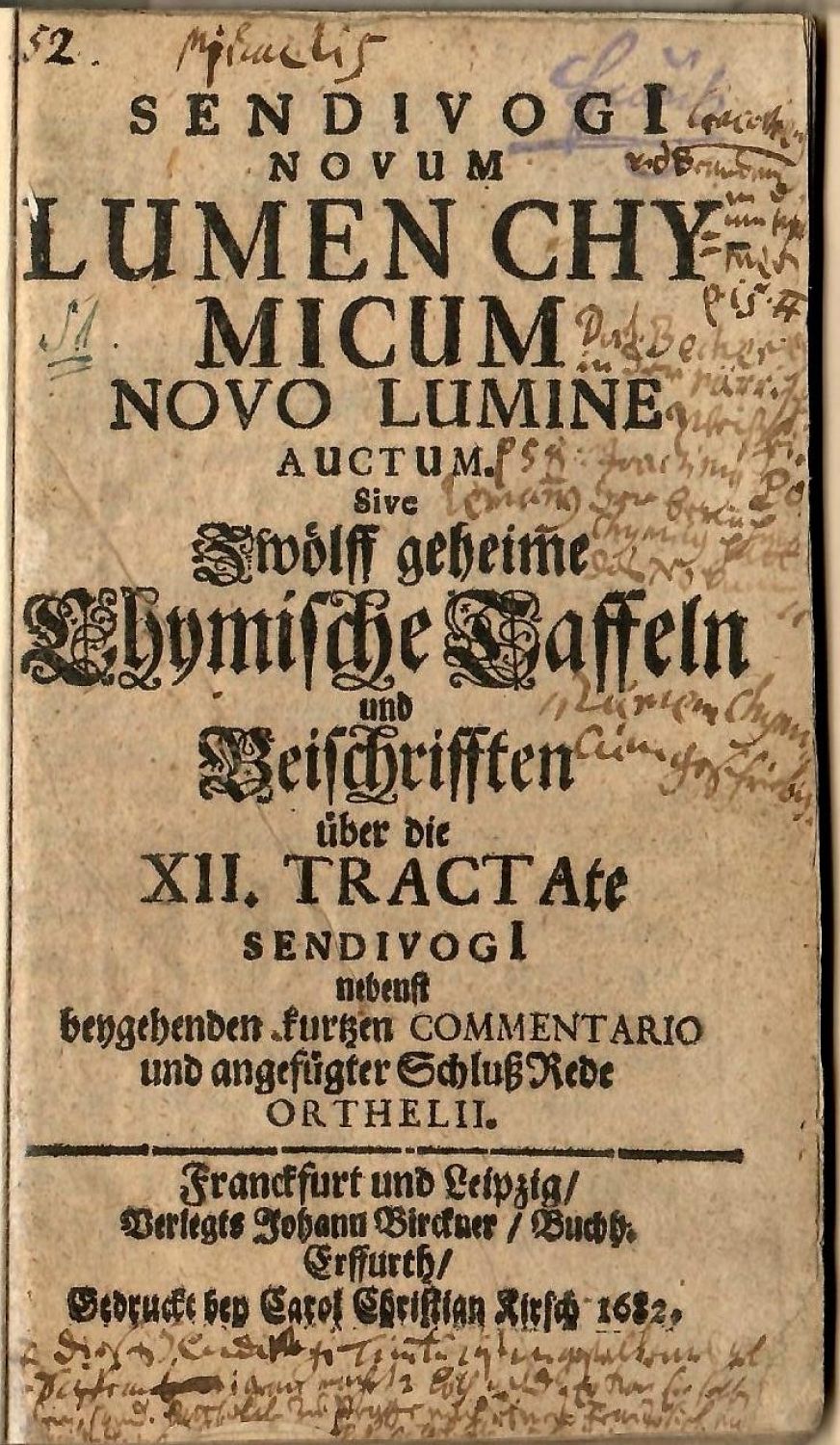 SENDIVOGI NOVUM LUMEN CHYMICUM NOVO LUMINE AUCTUM Sive Zwölf geheime Chymische Taffeln und Beischrifften über die XII. TRACTAte SENDIVOGI nebenst beygehenden kurtzen COMMENTARIO und angefügter Schluß Rede ORTHELII.