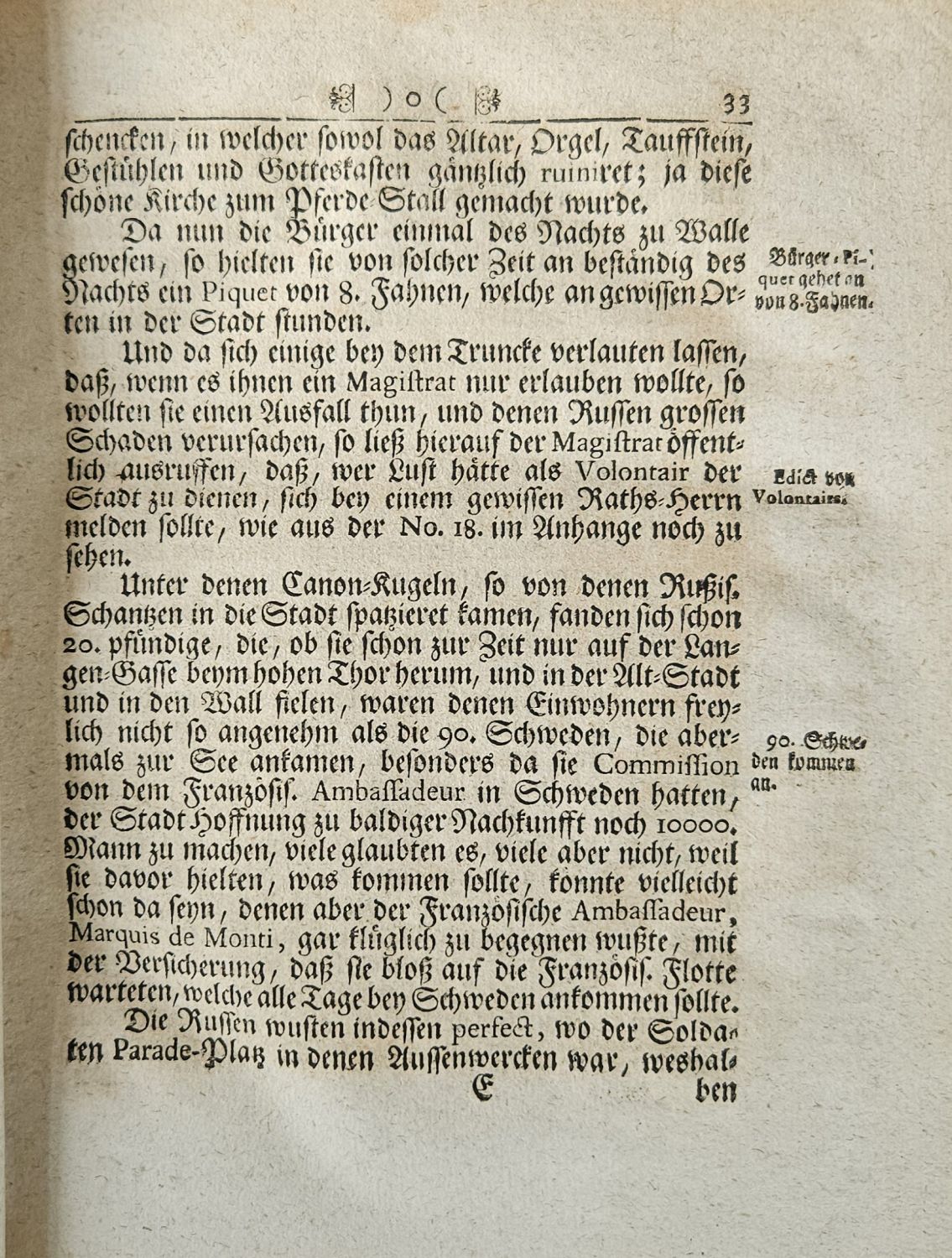 Tištěno švabachem, latinská slova antikvou, uprostřed horního okraje nula v obrácených kulatých závorkách mezi drobnými rostlinnými ozdůbkami od sazby oddělená jednoduchou linkou. Celkem sedm samostatných titulních listů, průběžná paginace, která však na sebe u jednotlivých dílů nenavazuje (viz rozpis stránkování). Plné iniciály propletené úponky zalomené do výše 2-7 řádků, pásové vlysy, viněty, tištěné poznámky po stranách. Druhý titulní list "Anhang Zu der accuraten und aufrichtigen Nachricht Von der Russisch= und Sächsischen Belager= und Bombardirung der Stadt Dantzig", třetí "Alt= und Neue Polnisch=Preussische Chronica .... Zweyter Theil", čtvrtý "Ordentliches Tage=Register Von denen Unternehmungen Derer Russen und Sachsen Bey der Belagerung Der Stadt Dantzig. Von unpartheyischer Feder entworffen", Cöln, Hans Paul Merian, 1737 (navazuje na díl předchozí), pátý "Thornische Begebenheiten, Welche Zu gleicher Zeit DANTZIGER Belagerung, 1733. und 1734. Sich merkwürdigst zugetragen. Von unpartheyischer Feder entworffen", Cöln, Hans Paul Merian, 1737, šestý "Elbingische Geschichte, Welche Zu gleicher Zeit Der DANTZIGER Belagerung 1734. Merkwürdigst sich zugetragen. Von unpartheyischer Feder entworffen", Cöln, Hans Paul Marian, 1737, sedmý "Anhang Des Kurtzen Auszuges Alter und Neuer Pohlnisch=Preussischen Kriegs=Geschichten, von Unpartheyischer Feder gesammlet", Cölln, Hans Paul Merian, 1740. <br>Ve front. mědirytina rytá C. Fritzschem dle D. Schulte, za stranou 142 rozkládací mědirytina (665 x 415 mm) s vyobrazením bombardovaného Gdaňsku signovaná Berolini (rytec) dle G. P. Busche, za str. 196 rozkládací mědirytina (330 x 190 mm) s vyobrazením mincí města Gdańsku, za str. 333 rozkládací rytina (210 x 225 mm) s vyobrazením pevnosti Weichselmünde v Gdaňsku, za str. 406 rozkládací rytina (250 x 215 mm) s vyobrazením kapitána Fischera a leutnanta Ringela, pozicemi ruských baterií a řekou Vislou, za str. 666 rozkládací tabulka s vyjmenovanými divisemi, jejich veliteli,... za str. 671 rozkládací rytina (300 x 380 mm) s vyobrazením města Toruně a jeho opevněním, za str. 744 rozkládací rytina (180 x 200) s vyobrazením osmanských velmožů, za str. 752 rozkládací rytina (225 x 390 mm) s vyobrazením městečka Leibitsch (Lubicz), za str. 788 rozkládací rytina (210 x 340) s plánem města Elbingen.<br>Dobová vazba s kartonovými deskami potaženými mramorovaným papírem, kožený hřbet a nárožnice, črveně barvené ořízky, ve hřbetu 5 vazů, ve druhém poli tlačený název (pravděpodobně se v poli nacházel původně kožený štítek), ve 3 poli torzo koženého štítku s tlačeným a zlaceným značením dílů, v ostatních polích tlačený a zlacený rostlinný ornament. Papírový pokryv místy odřený, kůže ve hřbetu při spodním i horním okraji hřbetu odřená, zlacení částečně vybledlé. Papír místy zahnědlý.