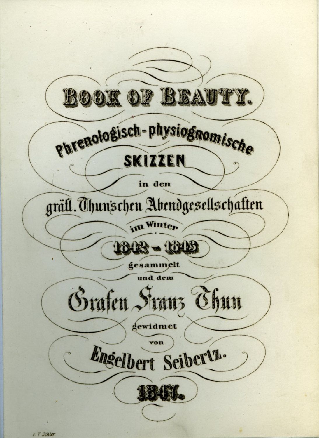 Ex. č. 24 ze 30 vydaných a číslovaných výtisků, uspořádali Láďa Ehrlich a Ota Lebenhardt, ůvod tištěn na holandském papíru van Gelder, reprodukce karikatur na tuhý papír, úvodní slovo napsal E. J. Kronbauer, tento ex. byl věnovaný paní Gertě Neumannové Oto Lebenhartem. Dobová vazba z hnědé hlazené vepřovice s pěti vazy ve hřbetu, na přední i zadní desce jednoduchý tlačený rámeček ze slabé linky, z jednotlivých vazů vybíhají do přední i zadní desky tlačené ozdůbky rostlinného charakteru, šitý kapitálek. <br>Karikatury jsou dílem německého malíře E. Siebertze, který od roku 1841 pobýval v Praze a v letech 1842-43 docházel na umělecké dýchánky pořádané hr. Thunem, mezi karikovanými jsou například Antonín a Josef Mánesová (viz foto), C. Wurbs, V. Kandler, A. Pucherna, Carl Egon Ebert, B. Hawránek, A. Lhota a řada dalších.