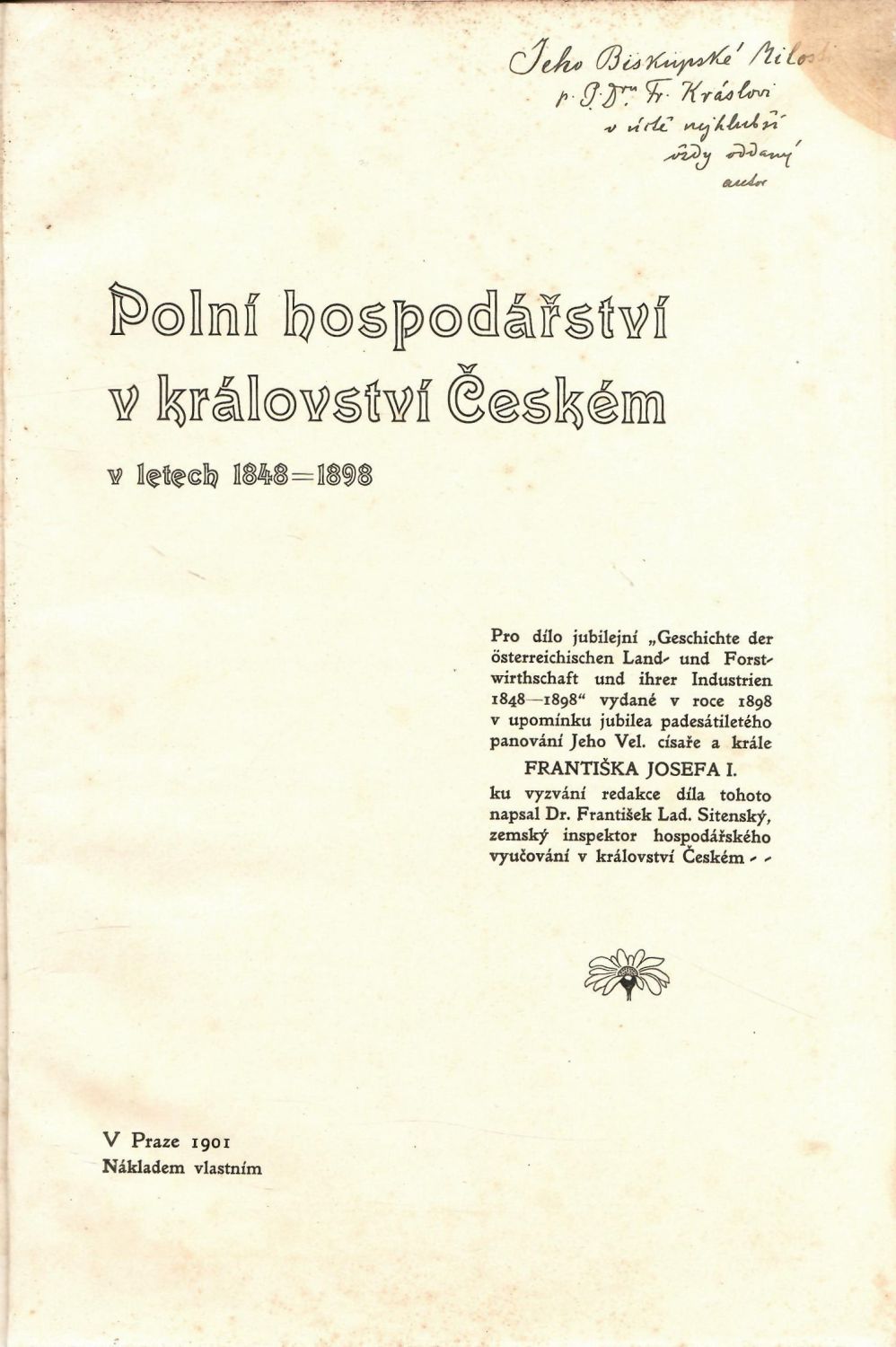 Ve front. hlubotiskem tištěný dvojportrét císaře Františka Josefa I. z roku 1848 a 1898. V textu několik fotograf. vyobrazení různých staveb souvisejících s hospodářstvím (odborných škol a hospodářských ústavů). - Původní zelená plátěná vazba s tlačeným a zlaceným názvem a květinou na přední desce, barvené ořízky. Vazba místy odřená, naražené rohy, při horním vnějším okraji hnědá skvrna o rozměru cca 3 x 2 cm, která je v celém knižním bloku. - Na titulním listu autorova dedikace černým perem: "Jeho Biskupské Milosti p. P.Dru. Fr. Kráslovi v úctě nejhlubší vždy oddaný autor".