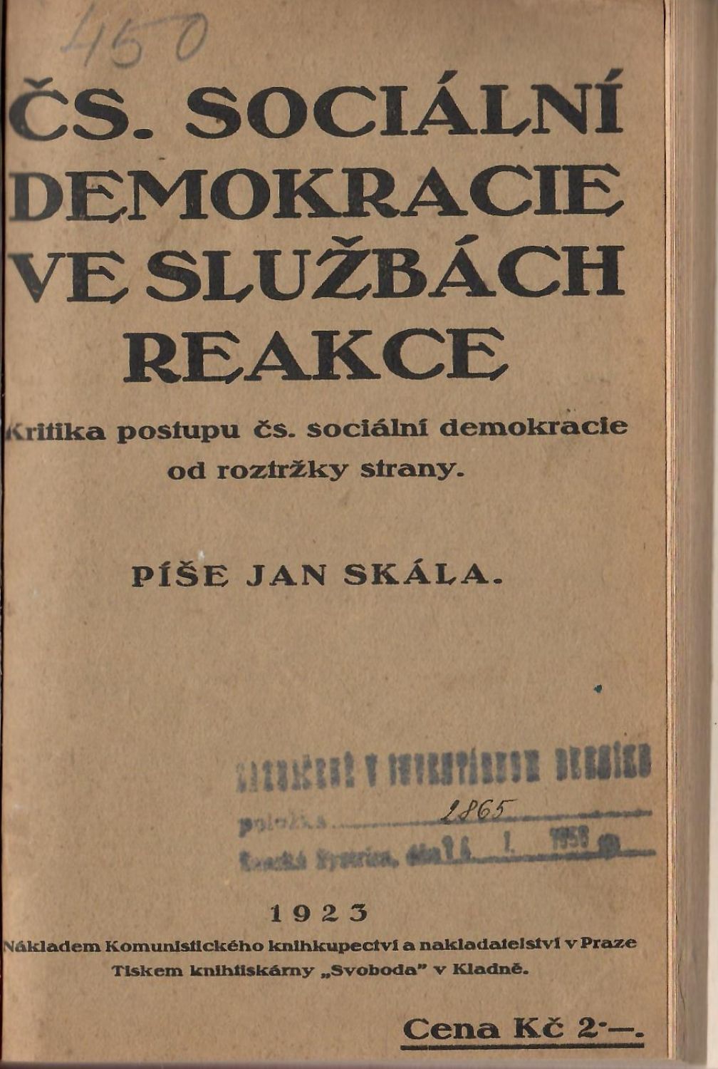 Papírová obálka vevázána. Uvnitř knihy několik razítek.