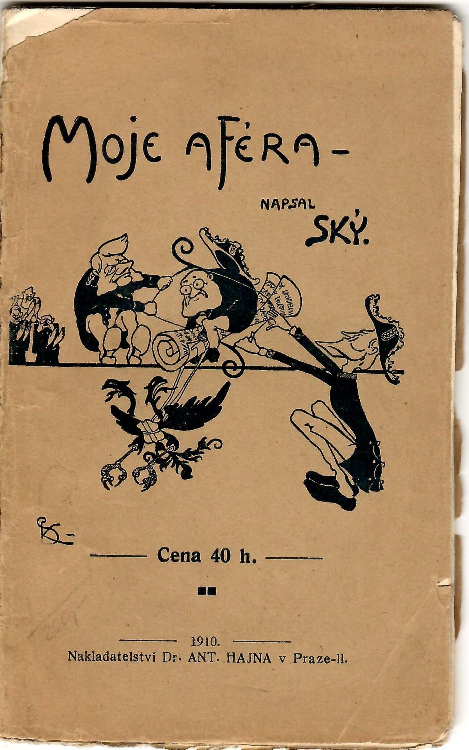 Na přední straně obálky ilustrativní karikatura, obálka při spodním vnějším okraji přeložená, při horním okraji u hřbetu chybí kousek papíru, papír ve hřbetu popraskaný, při horním okraji chybí kousek pap. přebalu.<br>Jiří Skorkovský (1.2.1873 Humpolec - 4.2.1931 Praha) byl český politik, člen Omladiny, roku 1897 byl obviněn z urážky jeho veličenstva císaře Františka Josefa, ve vykonstruovaném procesu připomínajícím nepovedenou frašku souzen a odsouzen, zároveň byl vyloučen z pražské university, kde studoval práva a současně byl zbaven možnosti studovat na jakékoliv rakousko-uherské universitě. V předvečer války byl redaktorem Večerníku Českého slova, za války byl obžalován z velezrady a opět uvězněn. V letech 1918-19 člen revolučního Národního shromáždění za nár. socialisty, roku 1919 byl osobním tajemníkem ministra národní obrany a šéfem jeho politického presidia, od roku 1920 byl ředitelem tiskárny M.N.O. Ve své anonymně vydané brožurce líčí téměř s 13 letým odstupem situaci, průběh a následky procesu v roce 1897 a svoje uvěznění, které se ovšem svojí délkou a poměry ve vězení panujícími jeví takřka odpočinkem ve srovnání s poměry a tresty vynášenými komunisty a jinými totalitními režimy.