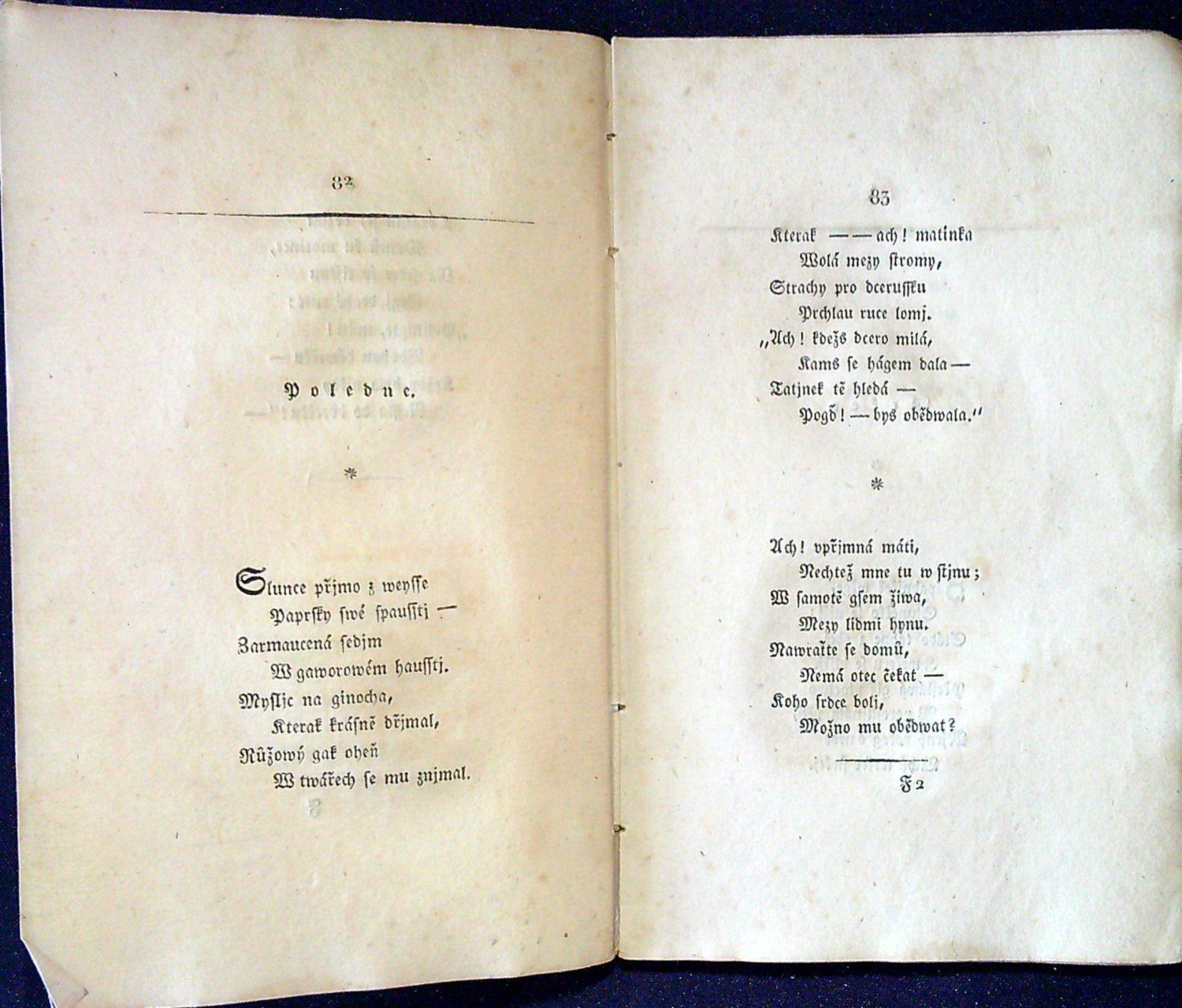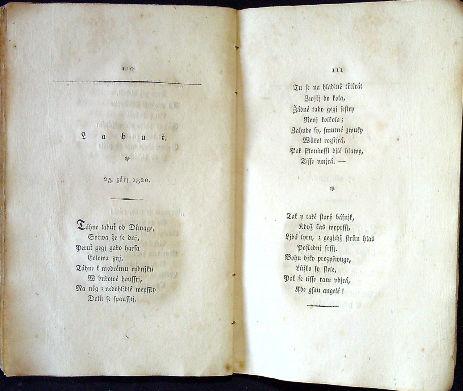 Tištěno frakturou, v záhlaví jednotlivých básní jednoduché linky, pod jejich názvem drobná tiskařská ozdůbka a mizící linka, v úvodu jednotlivých básní tučně tištěné versálky. Ve front. mědirytina "Poustevník", kterou dle předlohy J. Führicha vyryl G. Döbler. <br>Původní pap. obálka, zašpiněná, odřená, místy zkrabatělá a při okrajích potrhaná, oslí uši. - Druhý svazek sbírky vyšel roku 1830. Na rubu tištěné dedikace vlastnický přípis perem od Jiřího Šalamouna z roku 2017.